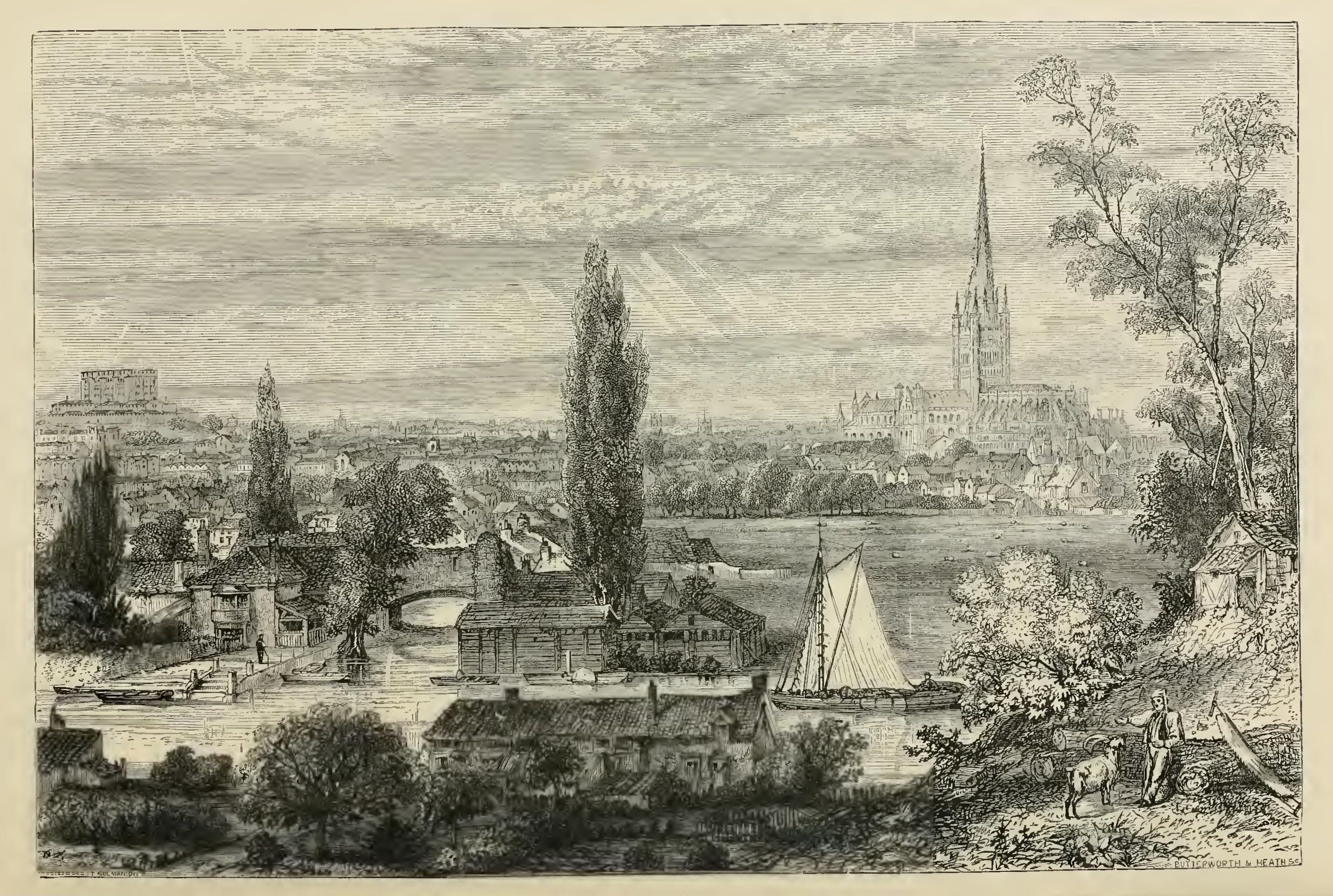 Surrounded by wooded slopes and pleasant meadows and winding streams, its streets full of quaint picturesque architecture, and dominated by its noble castle and cathedral, few or none of our English cities offer a more pleasing combination of urban and rural beauty.