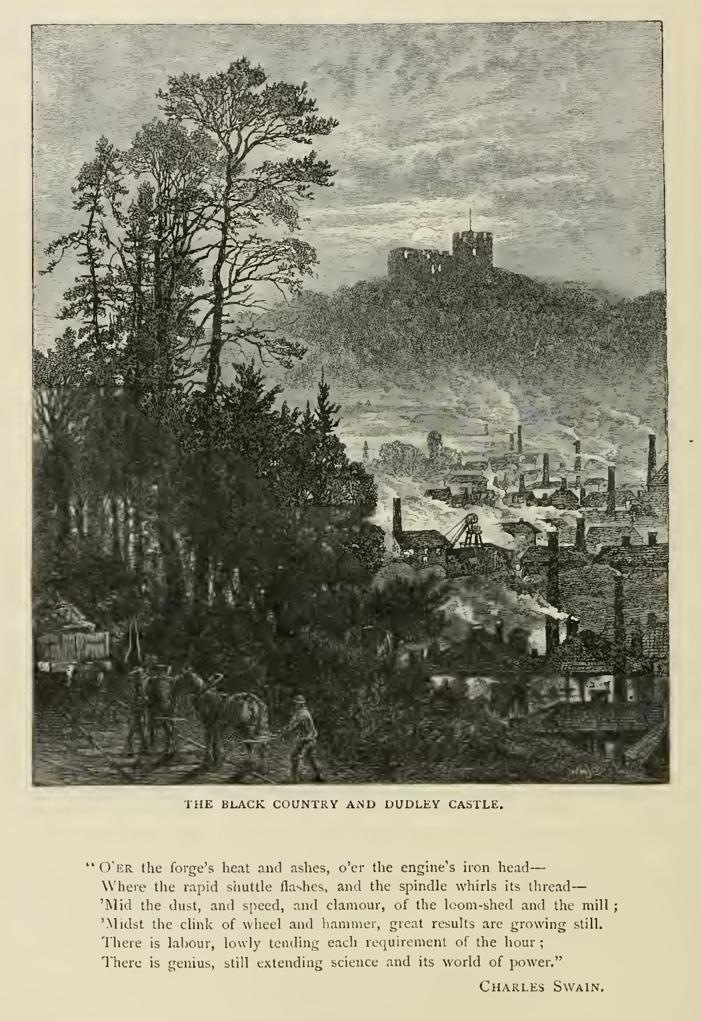 Nowhere, perhaps, is the contrast—due chiefly, no doubt, to geological structure—more apparent than on the edge of the "Black Country" in Staffordshire. From Dudley Castle the views are more curiously contrasted than in almost any other part of England. By night the whole country is lighted up on one side by the flames from the furnaces, which cover the country for many miles. By day the din of hammers and the clank of wheels, the roar of traffic and the shriek of the steam-whistles surge up, through the pall of smoke, upon the ear. Descend, and between the ironworks and coalpits the ground is unsightly with refuse heaps, while its frequent inequalities, and the bending, tottering buildings, show it to be honeycombed with mines. Vegetation is rare; what there is, is blackened and stunted; black also are the outsides of churches, chapels, schools. For inhabitants of such a district to gain any sense of natural beauty, they must be able at frequent intervals to escape; and, happily, to do this is within the reach of most. Railway communication with every part of England is constant and easy; and to know the difference that a few miles' journey will make in the scene, one has only to reascend to Dudley Castle, where it lies in the midst of its fair wooded domain.. Look from it to the north, east, or south, and all is smoke and flame; but turn to the west, and though the traces of unresting labour are still discernible, they soon give way to a country of richly diversified charm: glimpses are obtained of the beautiful valley of the Severn, the Wrekin towers grandly not many miles away, and the Malvern hills are dim and blue in the distance.