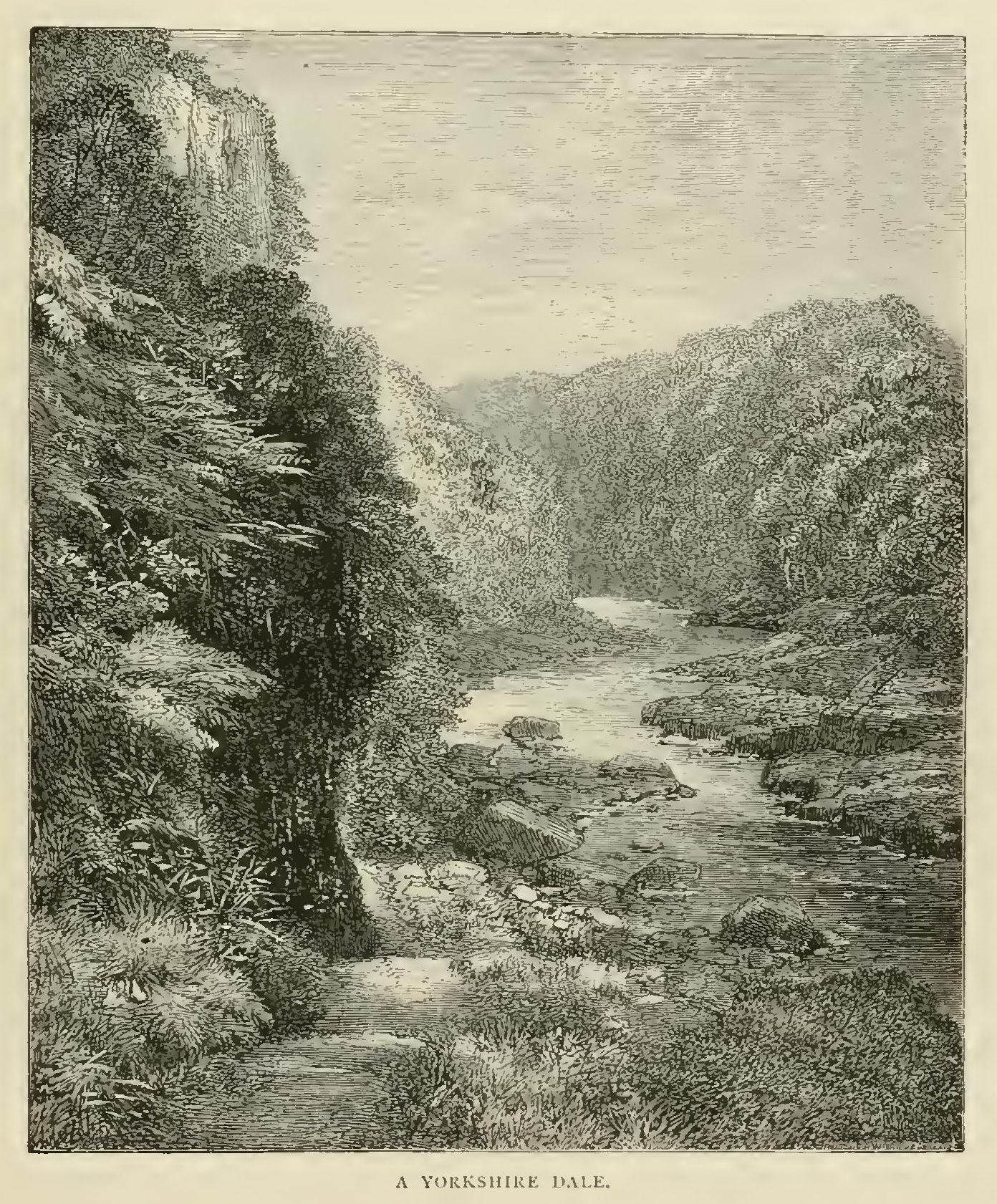 A little further again, our astonished friend comes upon a Clapham Junction, but it is amid the silence of the hills! Ingleborough, with its marvellous caves, too little known, with its companion heights, Pen-y-gant and Whernside, rise from the valley: and every path is full of beauty, especially that which leads into the heart of Craven, where bold limestone scars, deep glens, and upland moors, with one deep, lonely tarn, dear alike to dreamers and to anglers, yield a succession of pictures, of which, among their many charms, not the least is their easy accessibility from the neighbourhood of clanking mills and inky streams. For Ilkley, Bolton, Harrogate, Craven, Clapham may all be reached by the busy worker of Leeds or Bradford, and much of their beauty enjoyed, in the leisure of a summer Saturday afternoon, or on a "Bank holiday." He who would be free from excursionists, with their loud talk, their demonstrative ways, their baskets and their bottles, must go another time; but even in those holiday-hours there is much to interest. The "trippers" may be an interruption to the dreamer, an annoyance to the sensitive; but it is good that people whose lives are usually so hard-pressed and monotonous should have the means of ennobling enjoyment within easy reach; and though occasionally there may be an element of roughness or even intemperance in the recreation, we should be unjust were we not to record our impression, from what we have often seen, that there is a decided improvement in these respects, and that the free access to hill and moor, to fine scenery and pure air, has its part in checking those vices which spring up like evil weeds in the unwholesome dwellings of a crowded population.