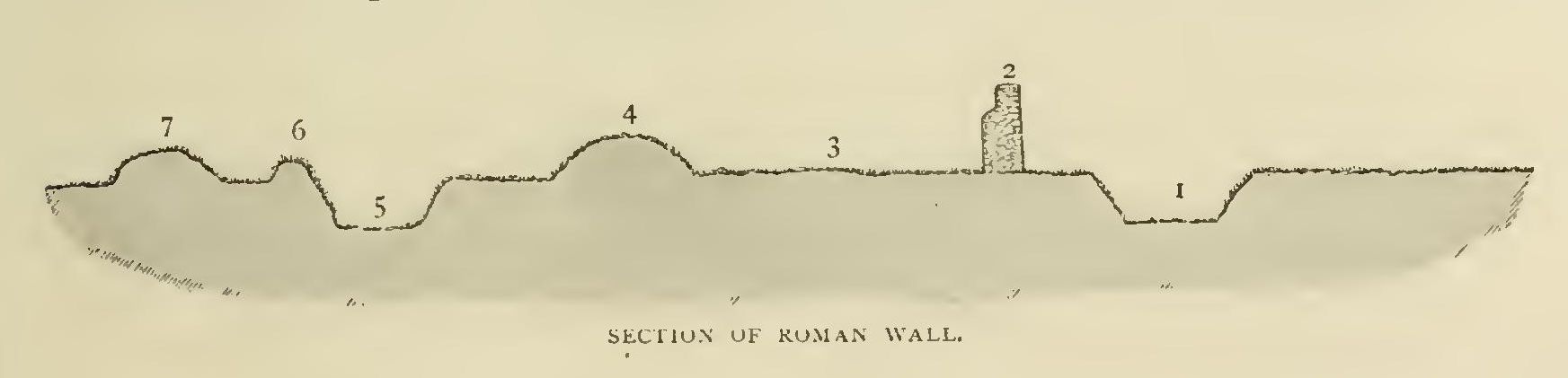 In many places the traveller, especially if aided by some competent guide, may discern the whole outline of the structure. It consisted of seven parts, viz., the Roman Wall proper, comprising ditch on the extreme northern side; (1) the military road; then the earthwork, consisting of (2) a wall; then (3) a space more or less wide from thirty feet to half-a-mile, middle of vallum, along of (4) a mound, or rampart, the largest of three; (5) a second ditch; (6) another mound, the smallest; and (7) yet another mound. The following section exhibits all in one view. Nor is this all, at every three or four miles we have fortified camps of several acres each, at every mile a castle, and between the castles watch-towers. Moreover, there are roads and bridges, traces of villas, gardens, and burial-places, making almost every inch from Thirlmoor, on the verge of the Cheviots, at the foot of heathery hills and through richly wooded vales, to Rothbury—already a famous place of resort from the district, and evidently destined to become more frequented from its surpassing beauty of situation, encircled by romantic hills, with the bright river running swiftly between.