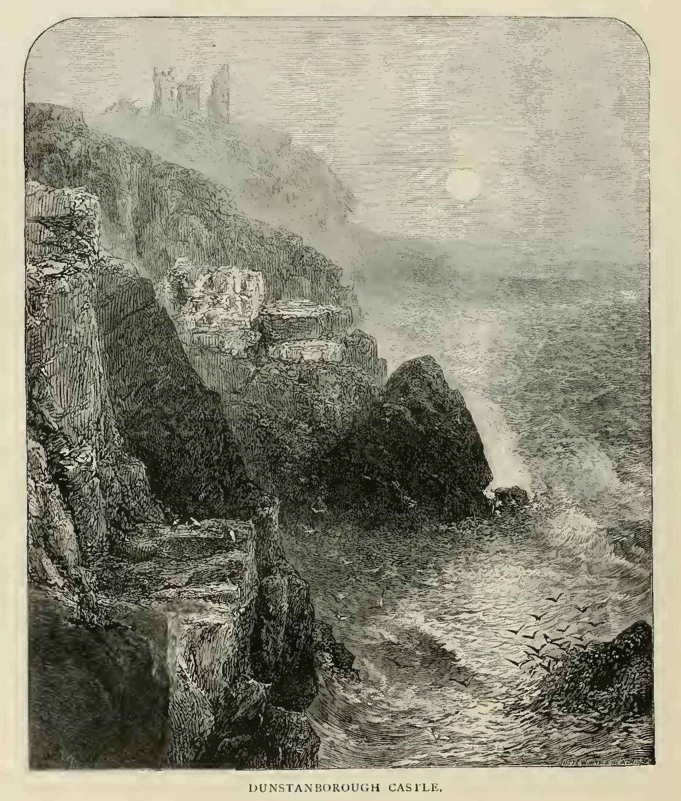 But for the full splendour of cliff and ocean scenery we journey still a little northward, and come to Dunstanborough Castle. Here a dark ridge of basalt rises in pillared form sheer from the sea, and in the words of Alarmion, "the whitening breakers," surging with ceaseless thunder into the caves which pierce the cliffs, "sound near,"