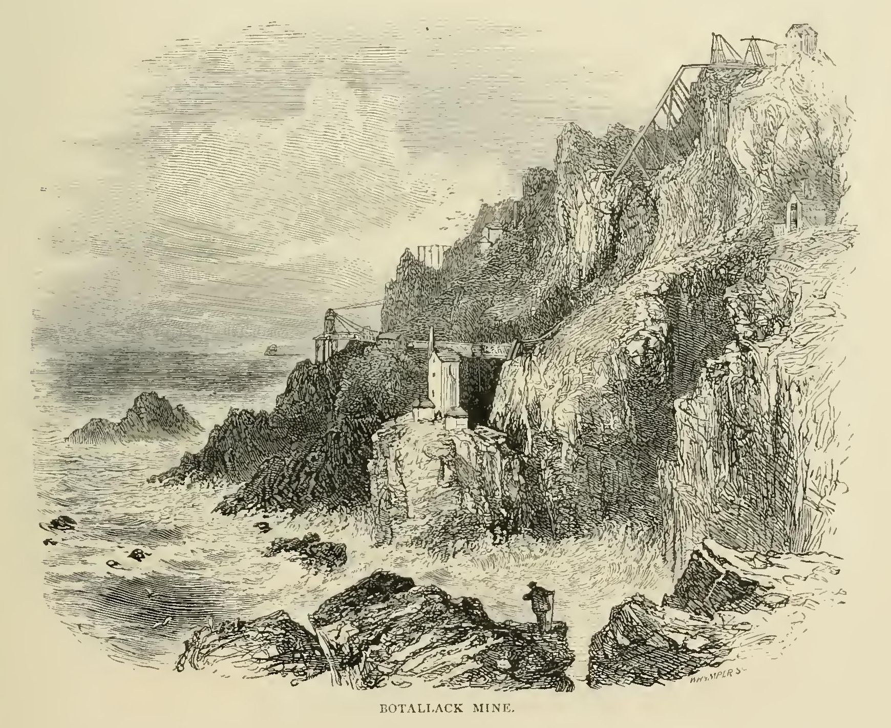 The two coast scenes are, perhaps, unequalled in the British Islands: the difference is that, while the Cornish scene lies in far-away seclusion, this of Northumberland is close by one of the chief lines of traffic, and within accessible distance of crowded populations. Yet even Cornwall is a great industrial centre. Its mining industries are never far away from us. Its wildest cliffs are pierced by shafts and adits leading down, as in the Botallack Mine, to labyrinthine passages far under the bed of the sea, where the miners can hear overhead the rush of the waves and the grinding together of the huge boulders.