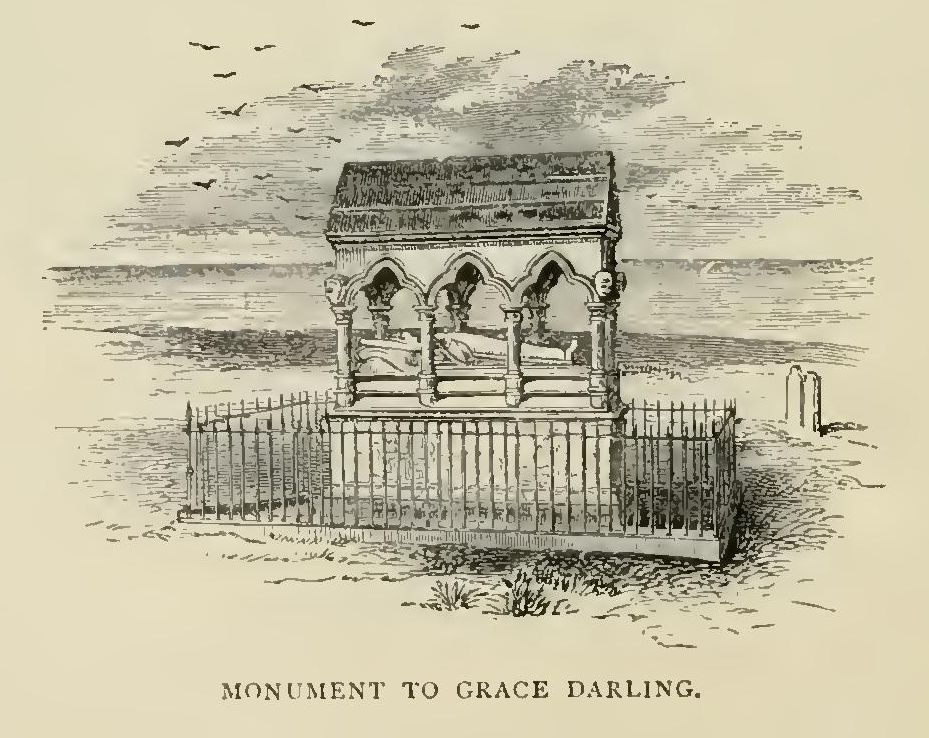 We have now reached the limit of our purpose, which was to show how near to the doors of the million is some of the most striking scenery of our land. Else from Dunstanborough Castle we could have pursued our way northwards at least as far as Bamborough Castle, not so much for the sake of admiring its noble ramparts and towers—once a fortress, now a temple of charity—or of gazing again upon the glories of cliff and sea, as of looking out across the waters to those rocky isles which, in our own time, have witnessed one of those deeds of unconscious heroism which do honour to our nature. For it was from one of those sea-beaten crags that, on the 5th of September, 1838, Grace Darling set forth upon her errand of mercy amid the raging waters, to rescue the survivors of the shipwrecked Forfarshire. "Her musical name," it has been said, "is the burden of a beautiful story of that love of man which is the love of Christ translated into human language and deeds." Four years after that great exploit the brave and gentle maiden died of consumption, brought on, it is said, by a visit to her brother, keeper of the lighthouse on Coquet Island: but she has left among our island race an imperishable name. Let us conclude these random rovings by a visit to her monument in Bamborough churchyard. Her figure lies as it were in slumber, an oar upon her shoulder, beneath a Gothic canopy, within sight and hearing of the waves. On the bright day of our visit the waves were murmuring and sparkling far below: the craggy islets in the distance were touched with sunlight, and we turned away, reminded less of the heroism that braved the storm, than of the heavenly home and the everlasting rest. "I saw a new heaven and a new earth, for the first heaven and the first earth were passed away; and there was no more sea."