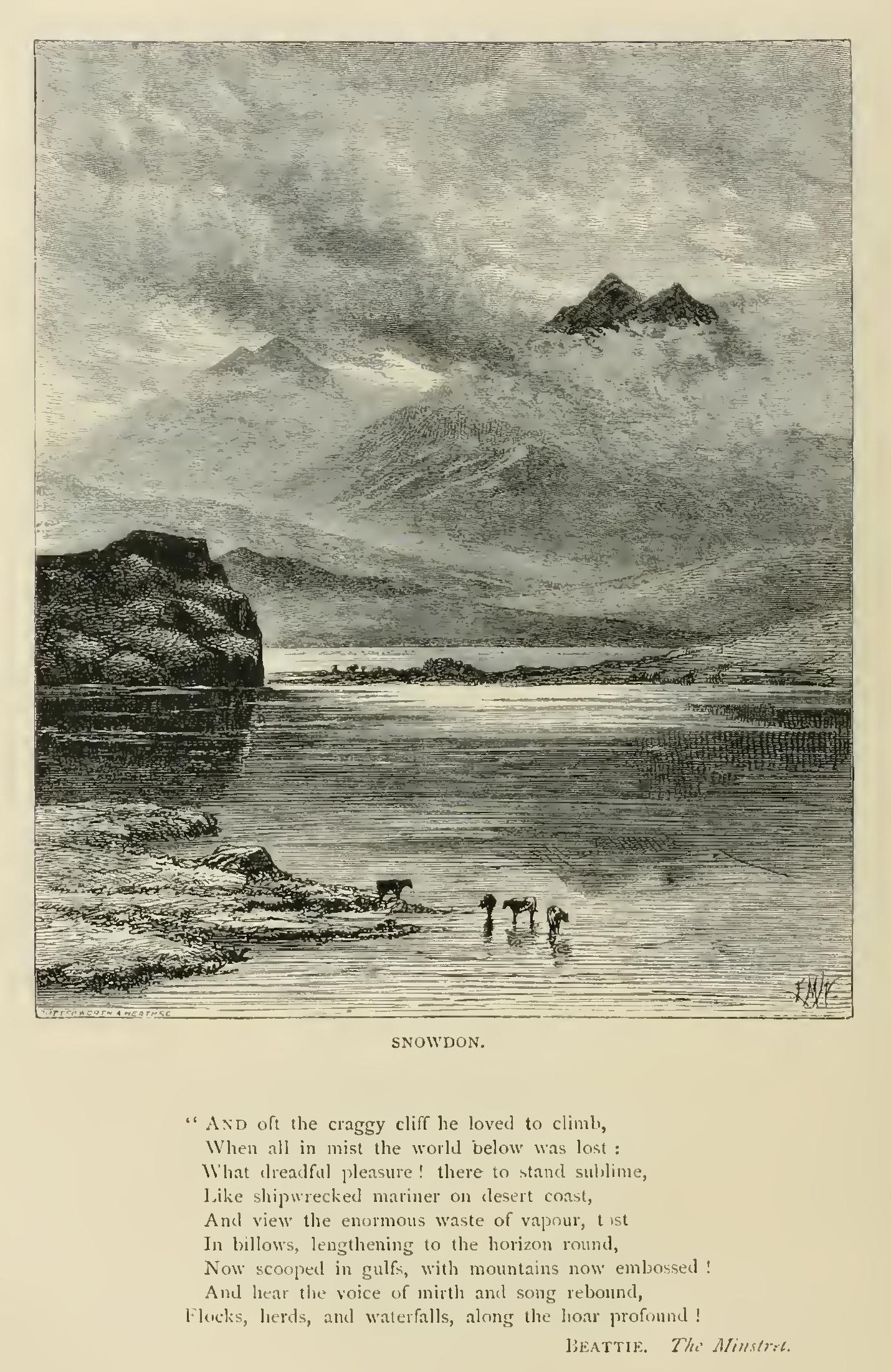 In one such little tour, so full of interest that it is hard to believe it to have extended only from Tuesday morning to Friday afternoon, we, some years ago, made our first acquaintance with Snowdon. Starting from Caernarvon before breakfast, we walked to Llanberis, by a road leading gradually upwards beside a wild mountain torrent, till the lake from which it issues was reached, and the impression of the mountain grandeur first fully felt.