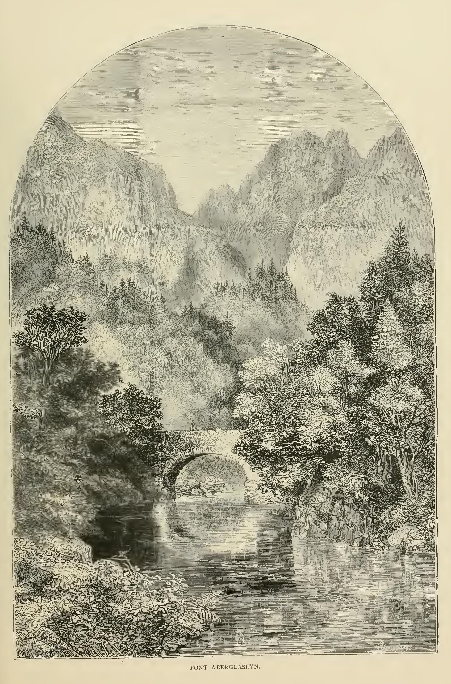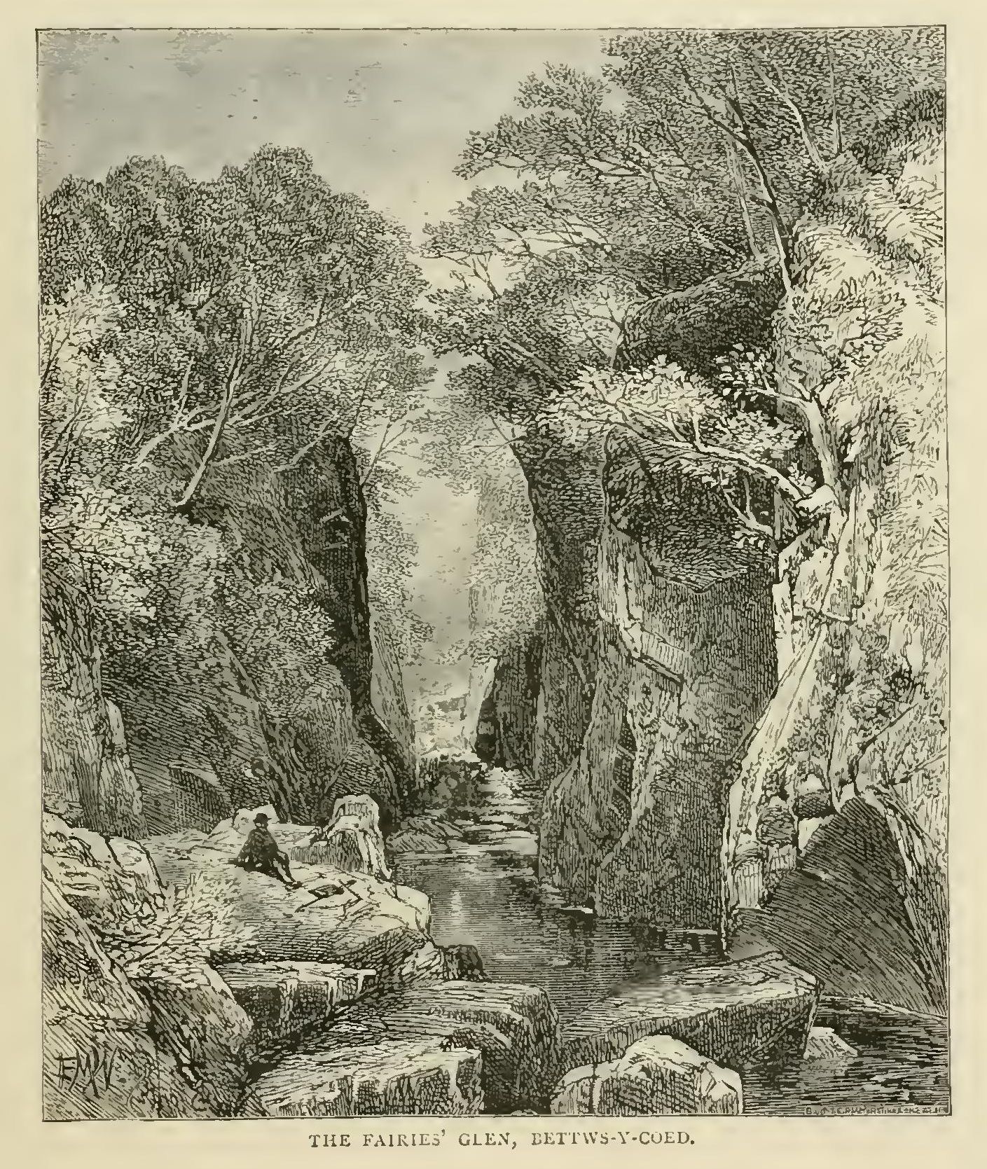 But if this bridge, with its many lovely points of view, struck us with a sense of familiarity, we were startled, as well as delighted, by the exceeding beauty of the Fairies' Glen. A tributary stream here comes down to the Lugwy between high wooded banks, and over mossy rocks, which at many points can easily be crossed; the course of the rapid crystal stream for a long distance is almost straight, and the perspective from below is singularly fine.