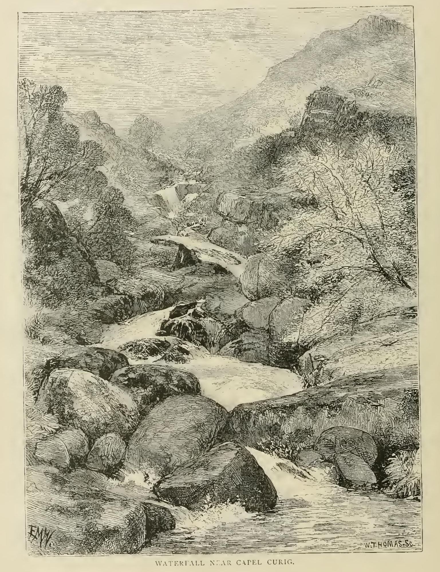 Reaching Pen-y-gwryd a little below the head of the Llanberis Pass, we pursued a route of a totally different character to Capel Curig. For the luxuriant beauty of Nant Gwynant we had now the sublimity of bare rock and crag; but there was something, we must suppose, uncongenial with our mood in the bleakness of the scene; at any rate, this part of the pass disappointed us. We have since found that the true grandeur of the defile is in the other, or western part, between Pen-y-gwryd and Llanberis. The rest at Capel Curig was specially welcome, and thence there was no want of interest in the route, on the bank of the romantic Lugwy. The Swallow waterfall must by all means be visited, repelled as is the true lover of nature by all those little arrangements that make the place a show—the urchin who points out the locked gate, for fear it should be missed, the keen-eyed dame with the keys, the guide to the torrent s brink, apparently solicitous lest any visitor should discover for himself the chief points of view, the miscellaneous guard of children, with a general expectancy of coppers.