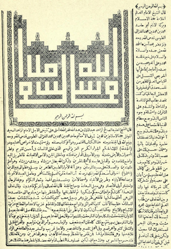 | Facsimile title page of the last book Al-Ghazali wrote, entitled “Minhaj Al-ʾAbidin.” On the margin this Cairo edition gives another of his celebrated works, “Badayat-al-Hadaya” | 232 |