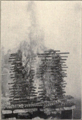 As the speeches were concluded, the Chinese Volunteer Band struck up a lively air and amid the deafening din of crackers and bombs a torch was applied to the oil-soaked stacks of pipes which at once burned up fiercely. Extra oil was thrown upon the flames and the glass lamp-covers, bowls, etc., were heaped upon the flames, thus completing a ceremony full of earnestness and meaning.