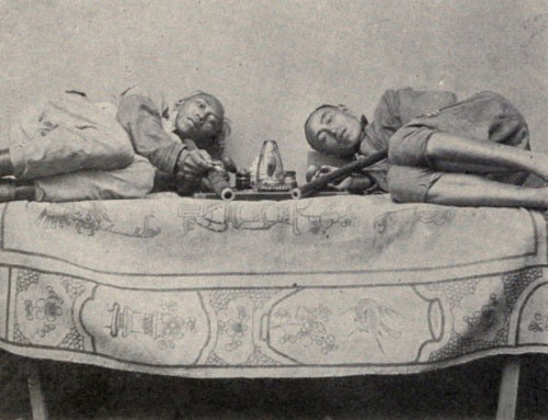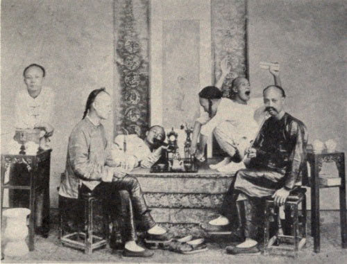 The smoking of opium began in China and is peculiar to the Chinese. The Hindoos and Malays eat it. Complicated and wide-spread as the smoking habit is to-day, it is a modern custom as time runs in China. There seems to be little doubt in the minds of those Sinologues who have traced the opium thread back to the tangle of early missionary reports and imperial edicts, that the habit started either in Formosa or on the mainland across the Straits, where malaria is common. Opium had been used, generations before, as a remedy for malaria; and these first smokers seem to have mixed a little opium with their tobacco, which had been introduced by the Portuguese in the early seventeenth century. From this beginning, it would appear, was developed the rather elaborate outfit which the opium-smoker of to-day considers necessary to his pleasure.