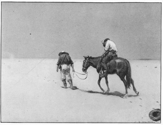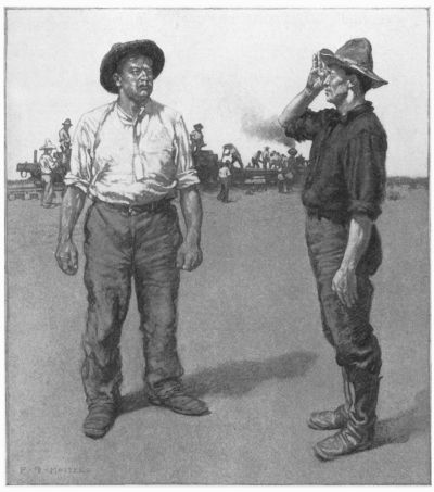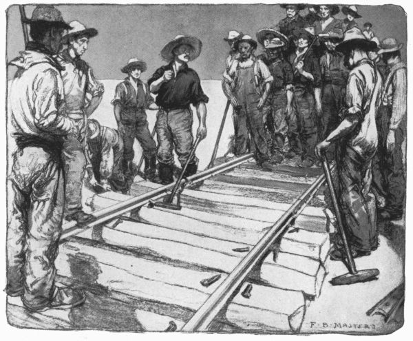Young Van flushed at this, but followed the chief out to the long street along which straggled the buildings that made up the settlement. These buildings were mostly saloons, each with its harvest of plainsmen, cowboys, laborers, and outcasts standing, sitting, or sprawling before the door. The day was hot with the dry heat of September, from which even the memory of moisture had long ago been sucked out. The dust rose at every step and settled on skin and clothing. Now and then a lounging figure rose and moved languidly in through a saloon door. Almost the only other movement to be seen was the heat vibration in the atmosphere. The only sound, beyond a drawled[Pg 302] remark now and then, and the clink of glasses, was the tinkle of a crazy piano down the street. But the bronzed, sinewy engineers, who had for months known no other atmosphere, stepped off in a swinging stride, and soon were past the end of the street and out in the open. Carhart himself was not above a sense of elation, and he fell into reminiscence.