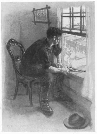 Then something happened. The door leading[Pg 310] to the bar of the Acme Hotel suddenly opened, and a hulking figure of a man appeared on the broad step. He was half drunk, and he carried a revolver in his hand. Behind him, crowding out to see the fun, came a dozen men. Charlie saw this, and, without in the slightest relaxing his genial smile, he drew out one of his own revolvers and held it carelessly before him with the muzzle resting on the window sill. Never for an instant did he take his good-natured, bloodshot eyes from the man across the street.