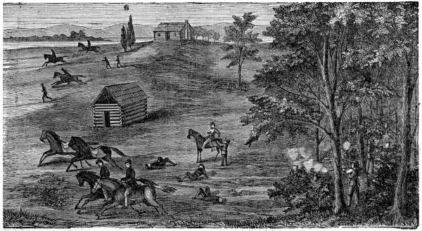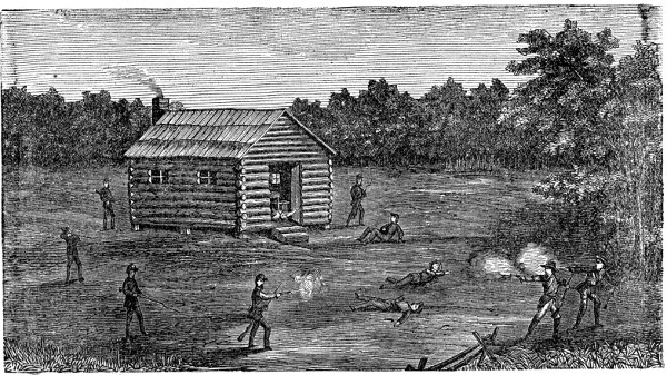 Andy Bean broke to run, and jumped the fence by a walnut tree just as a shot passed through his fiery red whiskers, grazing his face sufficiently to saturate them, and to make him believe that they were one huge stream of blood. The whole party now broke, and on leaping the fence fired off their guns, some of their shots piercing the door, one passed through my uncle‘s wrist, some struck the house, and some missed creation.