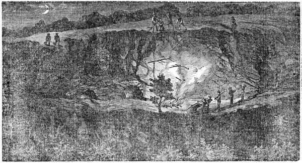 I retired from the cave during the night, and was absent when the party came to see my castle. They remained near the cave all day, but did not think it prudent to peep in to see whether I was at home or not. On the following night they built a large fire on the projection in front of the cavern, and kept it supplied with wood which they threw from the top of the bluff.
