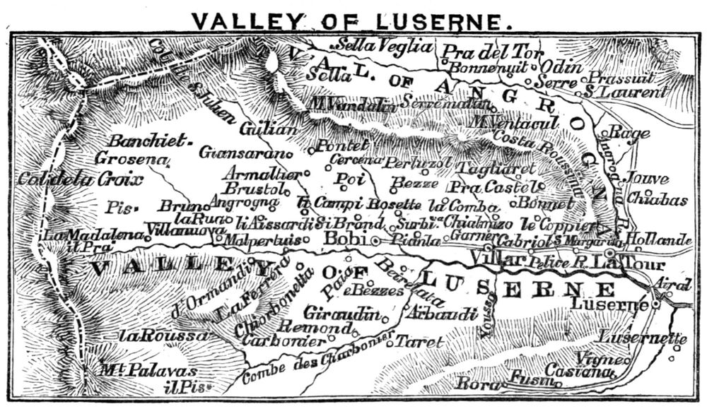 Footnote 109: Of the nineteen companies three were composed of the Vaudois of Angrogna; those of Bobi and St. John furnished two each; and those of La Tour, Villar, Prarustin, Prali, Macel, St. Germain, and Pramol, furnished one each. The remaining six companies were composed of French Huguenot refugees from Dauphiny and Languedoc under their respective officers. Besides these, there were different smaller parties who constituted a volunteer company. The entire force of about eight hundred men was marshalled in three divisions—vanguard, main body, and rearguard—and this arrangement was strictly observed in the order of march.[Back to Main Text]