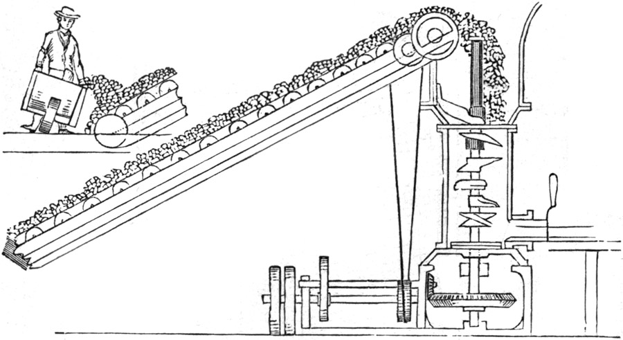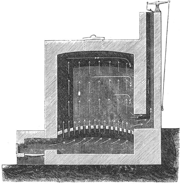 On the bog of Allen, in Ireland, we have an example of this kind. Peat is placed in iron ovens in the form of truncated pyramids, the bottoms of which consist of movable and perforated iron plates. The ovens are mounted on wheels, and run on a rail track.