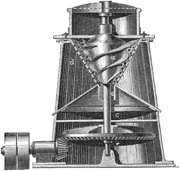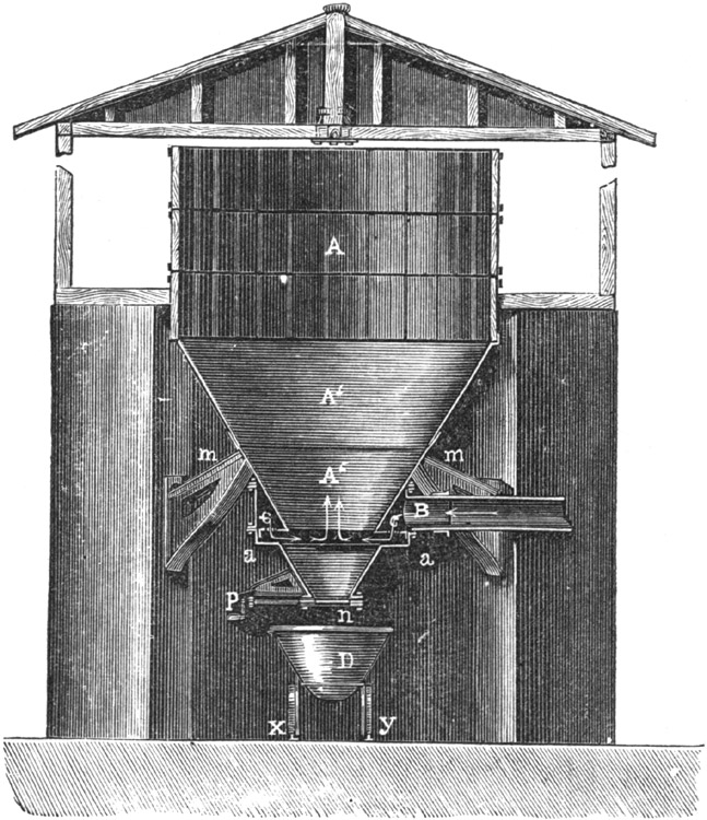 In the cut, A represents the section of a wooden cylinder about 10 feet wide and 6-½ feet deep, which surmounts a funnel of iron plate A'. The mouth of the funnel is closed by a door n; about 20 inches above the door the pipe B, which conducts hot air, terminates in the ring a a, through the holes in which, e e, it is distributed into the funnel filled with peat. The air is driven in by a blower, and is heated by circulating through a system of pipes, which are disposed in the chimney of a steam boiler. From time to time a quantity of dried peat is drawn off into the wagon D, which runs on rails, and a similar amount of undried peat is thrown in above.