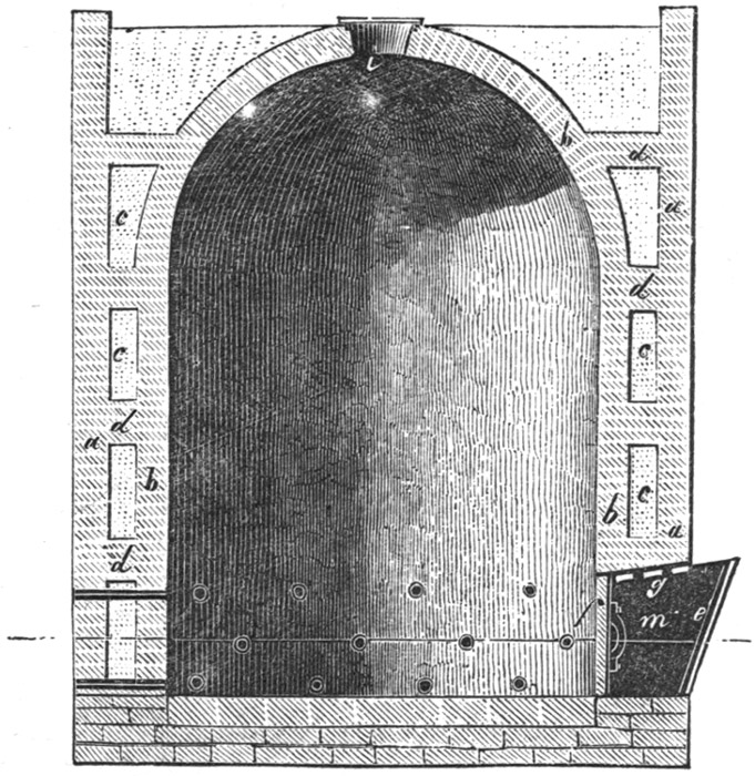 At the Gun Factory of Oberndorf, in Wirtemberg, peat is charred in the kiln represented in the accompanying figure. The chamber is 9 feet high, and 5-½ feet in diameter. The oven proper, b b, is surrounded by a mantle of brick a a, and the space between, c c, is filled with sand. Each wall, as well as the space, is 15 inches in thickness, and the walls are connected by stones d d, at intervals of three feet. Above the sole of the kiln, are three series of air holes, made by imbedding old gun barrels in the walls. The door, which serves to empty the kiln, is a plate of cast iron, the sides of its frame are wider than the thickness of the wall, and by means of a board e, a box m can be made in front of the door, which is filled [Pg 159]with sand to prevent access of air. The peat is filled in through i, a channel being arranged across the bottom of the kiln, from the door f, for kindling. When the firing begins, the lowest air-holes and i are open. When, through the lower gun barrels, the peat is seen to be ignited, these are corked, and those above are opened. When the smoke ceases to escape above, all the openings are closed, m, is filled with sand, i is covered over with it, and the whole is left to cool. It requires about 8 to 9 days to finish the charring of a charge. Several kilns are kept in operation, so that the work proceeds uninterruptedly.