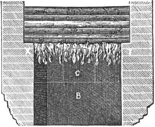 Peat is either charred in pits and heaps, or in kilns. From the regularity of the rectangular blocks into which peat is usually formed, it may be charred more easily in pits than wood, since the blocks admit of closer packing in the heap, and because the peat coal is less inflammable than wood coal. The heaps may likewise be made much smaller than is needful in case of wood, viz.: six to eight feet in diameter, and four feet high. The pit is arranged [Pg 158]as follows: The ground is selected and prepared as for charcoal burning, and should be elevated, dry and compact. Three stout poles are firmly driven into the ground, so as to stand vertically and equi-distant from each other, leaving within them a space of six or eight inches. Around these poles the peats are placed endwise, in concentric rows to the required width and height, leaving at the bottom a number of air-channels of the width of one peat, radiating from the centre outwards. The upper layers of peat are narrowed in so as to round off the heap, which is first covered with dry leaves, sods, or moss, over which a layer of soil is thrown. Dry, light wood being placed at the bottom of the central shaft, it is kindled from one of the canals at the bottom, and the charring is conducted as is usual in making wood coal. The yield of coal ranges from 25 to 35 per cent. of the peat by weight, and from 30 to 50 per cent. by volume.