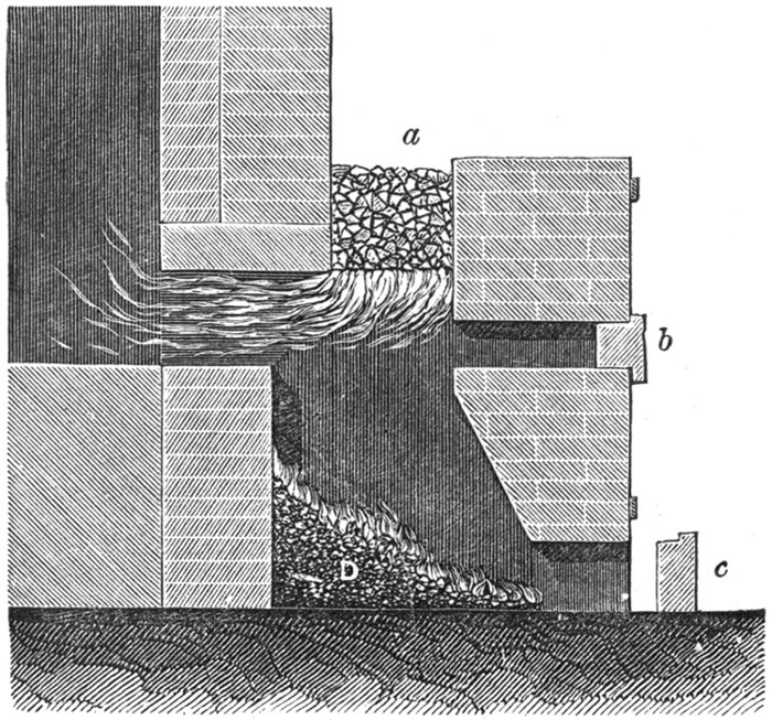 At Staltach, Weber prepares peat coal in a cylinder of sheet iron, which is surrounded by masonry. Below, it rests on a grating of stout wire. Above, it has a cover, that may be raised by a pulley and on one side is attached a small furnace, figure 24, the draught of which is kept up by means of a blower, or an exhauster, and the flame and hot [Pg 160]gases from it, which contain no excess of oxygen, play upon the peat and decompose it, expelling its volatile portions without burning or wasting it in the slightest degree. The construction of the furnace, see fig. 24, is such, that the sticks of wood, which are employed for fuel, are supported at their ends on shoulders in the brick-work, and the draught enters the fire above instead of below. The wood is hereby completely consumed, and by regulating the supply of air at a (fig. 25) by a sliding cover, and at b by a register, the flame and current of air which enters the cylinder containing the peat, is intensely hot and accomplishes a rapid carbonization of the peat, but as before [Pg 161]stated, does not burn it. In this furnace the wood, which is cut of uniform length, is itself the grate, since iron would melt or rapidly burn out; and the coals that fall are consumed by the air admitted through c. The hot gases which enter the cylinder filled with peat near its top, are distributed by pipes, and, passing off through the grating at the bottom, enter the surrounding brick mantle. Before reaching the exhaustor, however, they pass through a cooler in which a quantity of tar and pyroligneous acid is collected.
