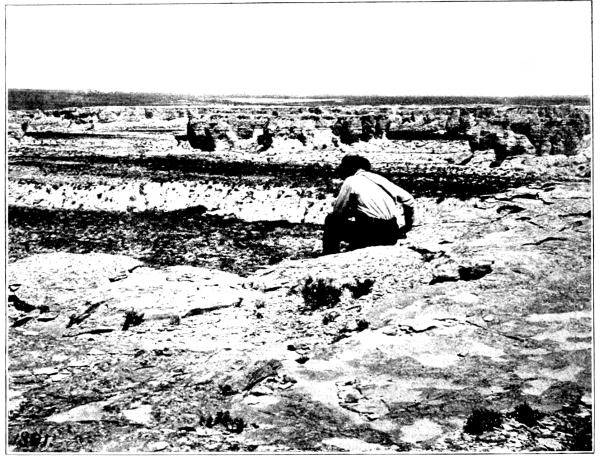 After the ocean had dried up and the bottom had been raised far above the present level of the oceans, other deposits made in lakes and by the winds covered deeply the consolidating sediments, burying them for millions of years with all that they contained. Long-continued erosion by winds and rains has again laid bare many parts of the old ocean bottom, and has washed them out into ravines and gullies. Many hundreds of square miles of this chalk are now laid bare in western Kansas, upon which the growth of vegetation has been prevented by the arid climate. Here and there may now be discovered protruding from the sloping or precipitous surfaces of this exposed chalk bones or parts of bones of the old animals buried so long ago in the soft sediment of the ancient ocean bottom.