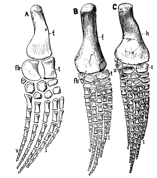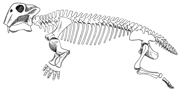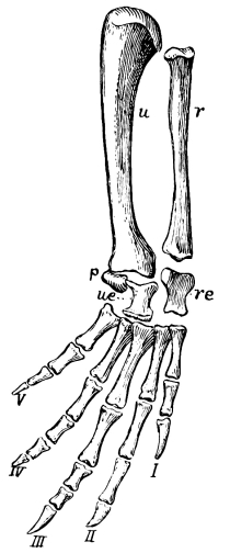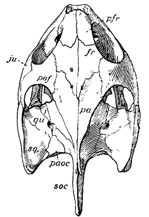 It is an interesting fact in the history of the vertebrates, as of all other groups of animals and plants, that the chief divisions arose early in geological history. Every known order of amphibians and reptiles, unless it be that including the blind-worms, was differentiated by the close of the Triassic period. The frogs are now known from the Jurassic. The mammals and birds also quite surely date their birth from the Triassic. And this early differentiation of the chief groups is doubtless due to the fact that the potentialities of diverse evolution are limited by specialization. It is apparently a law that evolution is irreversible, that it never goes from the special to the general, that an organism or an organ once extinct or functionally lost never reappears. And it is also a law in evolution that the parts in an organism tend toward reduction in number, with the fewer parts greatly specialized in function, just as the most perfect human machine is that which has the fewest parts, and each part most highly adapted to the special function it has to subserve. And these laws explain why it is that no highly specialized organism can be ancestral to others differing widely from it. The more radically distinct an organism is from its allies, the earlier it must have branched off from the genealogical tree. [Pg 4]