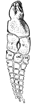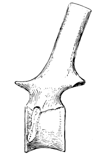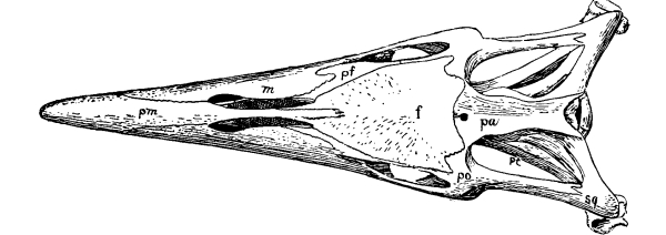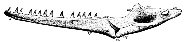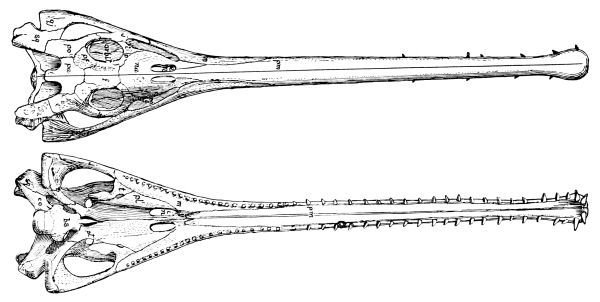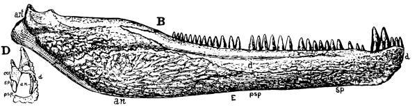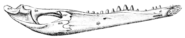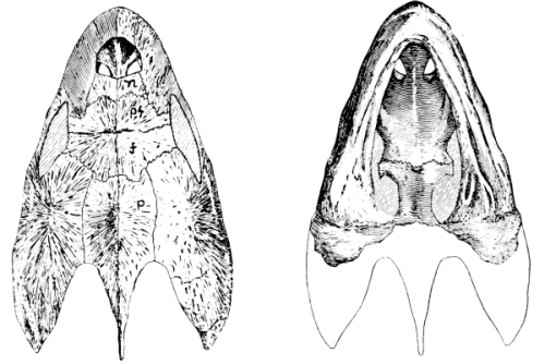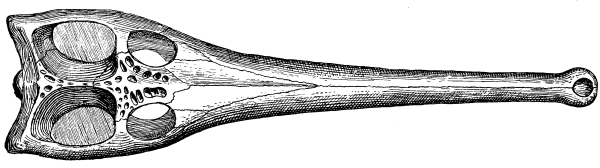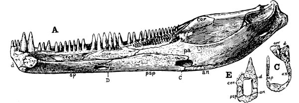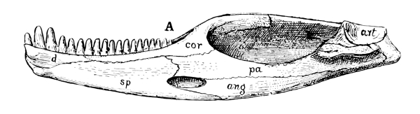 [4] “The author showed drawings and some specimens of two hitherto unknown reptiles from the white, coarse-grained sandstone, of which one in the form of the skull resembles the gavial, but is distinguished by the cylindrical form of the lateral teeth of the jaws; he therefore calls it provisionally cylindricodon, and a second species or genus, of which, however, so far only fragments of the jaws have been found, because of the four-cornered form of the teeth, cubicodon, while at the same time for the genus or family, to which the remains of these animals have belonged, he proposes the name Phytosaurus, since the teeth seem to be more adapted to a vegetable diet, even though they have not been worn away, as in Iguanodon.”—Isis (1828), p. 441 (translation).