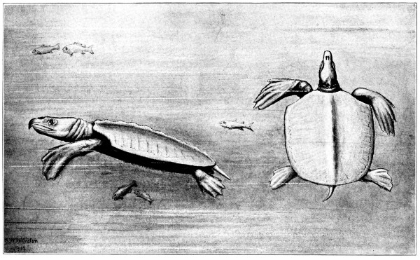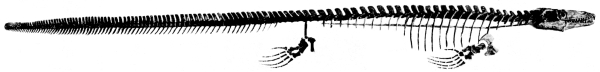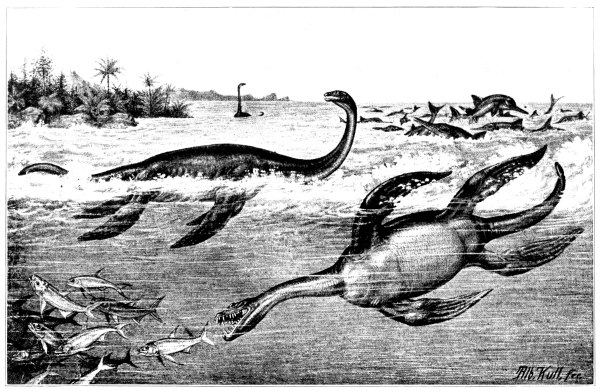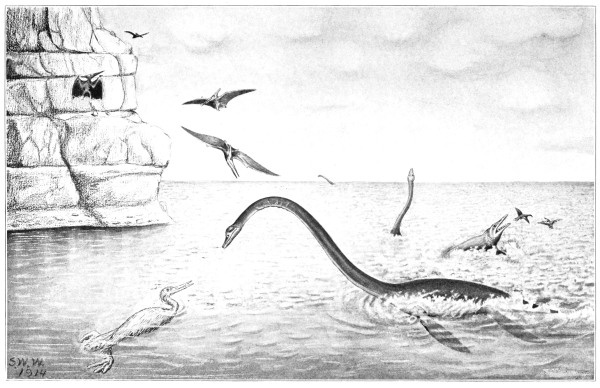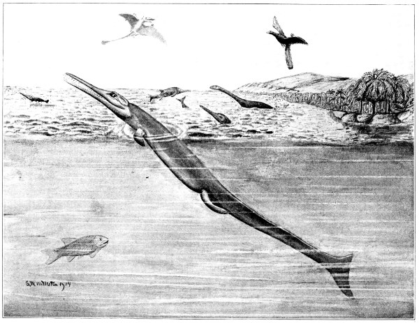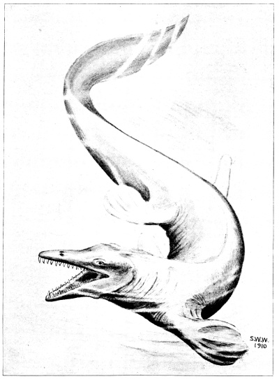 It was just forty years ago that the writer of these lines, then an assistant of his beloved teacher, the late Professor B. F. Mudge, dug from the chalk rocks of the Great Plains his first specimens of water reptiles, mosasaurs and plesiosaurs. To the youthful collector, whose first glimpse of ancient vertebrate life had been the result of accident, these specimens opened up a new world and diverted the course of his life. They were rudely collected, after the way of those times, for modern methods were impracticable with the rifle in one hand and the pick in the other. Nor was much known in those days of these or other ancient creatures, for the science of vertebrate paleontology was yet very young. There were few students of fossil vertebrates—Leidy, Cope, and Marsh were the only ones in the United States—and but few collectors, of whom the writer alone survives.