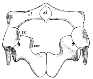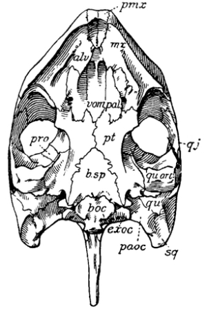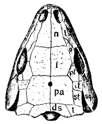 [1] Paired maxillae, premaxillae, nasals, prefrontals, lacrimals, frontals, parietals, dermosupraoccipitals, tabularia, supratemporals, intertemporals, squamosals, jugals, quadratojugals, postorbitals, postfrontals, quadrates, exoccipitals, paroccipitals, vomers, palatines, pterygoids, sphenomaxillae, stapes, transverse, alisphenoids or orbitosphenoids, epipterygoids, articulars, prearticulars, angulars, surangulars, coronoids, splenials, dentaries, one supraoccipital, one basioccipital, one basisphenoid, one ethmoid.