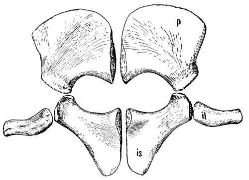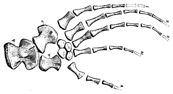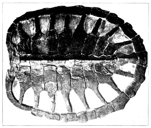 Not only do we learn from the remains preserved in the rocks the precise shape and structure of the bones of the skeleton and their precise articulations, but we are often able to determine not a little regarding the forms which the living animals had by the impressions made by the dead bodies in the soft sediment which inclosed them before decomposition of the softer parts had ensued, sediments which afterward solidified into hard rock. But these impressions are, with rare exceptions, only those of profiles or of flattened membranes. The rounded bodies of life do not retain their shape long enough for the sediment to harden; in most cases the flesh has decomposed before being entirely covered by sediment. Sometimes the integument and scales in a carbonized condition are actually preserved, retaining some of the actual structure of the organized material. The carbon pigment of the skin has sometimes been preserved in patterns indicating the color-markings in some of these ancient reptiles; and even the microscopic structure has been detected in carbonized remains of organs. Fossil stomach contents, the bony remains of unhatched young, as well as the delicate impressions of skin and membrane, all add to our knowledge of the structure and habits of the animals which lived so long ago. Many other things also may be learned, or at least inferred, concerning the living animals and their habits from the positions in which the skeletons are found, from the nature of the rocks which inclose them, or from the character and abundance of other fossils found with them. The frequent discovery of bones which had been injured and mended during life, or the living amputation of members, often tell of the characteristics of the creatures. So, too, the climatic conditions under which the animals lived may often be inferred with [Pg 7] tolerable certainty; the presence of “stomach-stones” reveals something of the food habits, and even of the structure of the alimentary canal, etc.