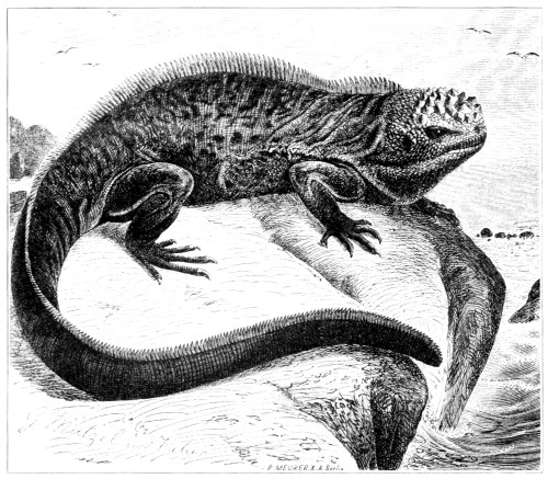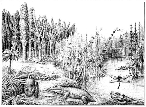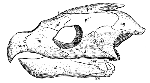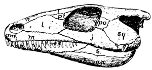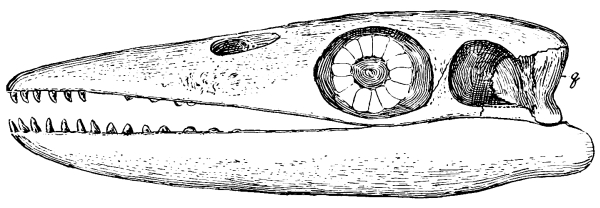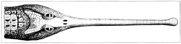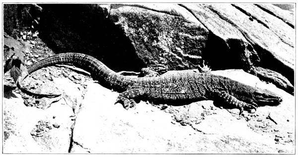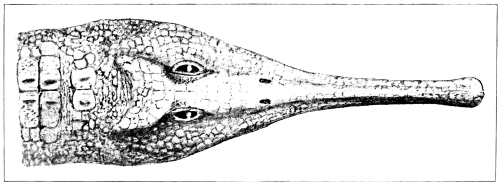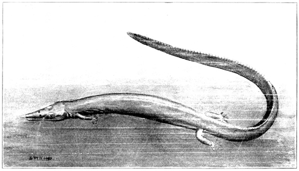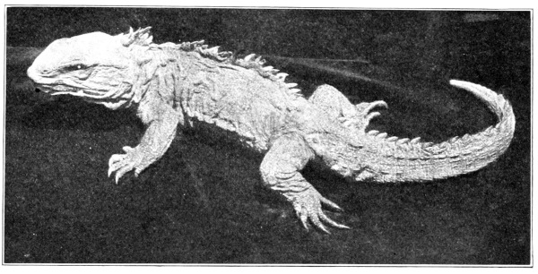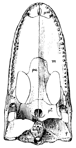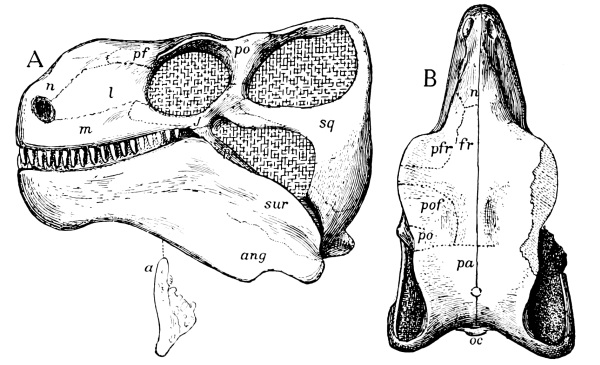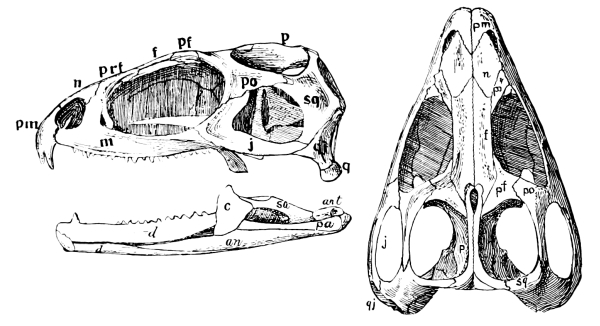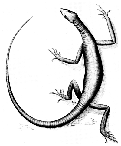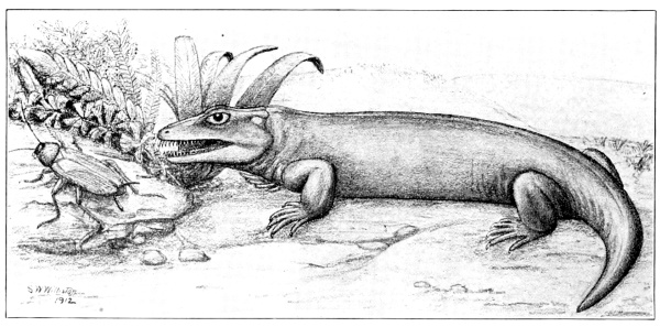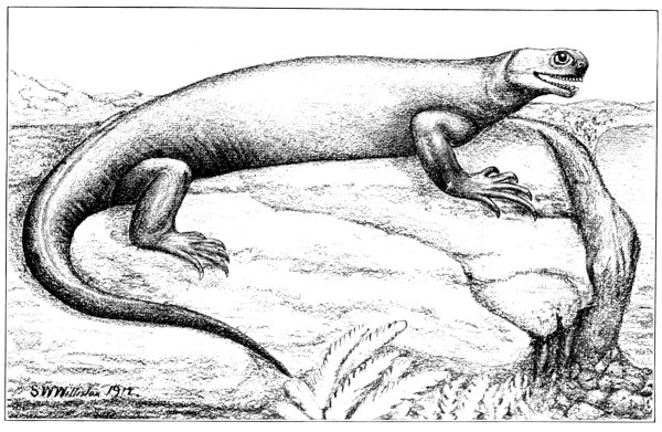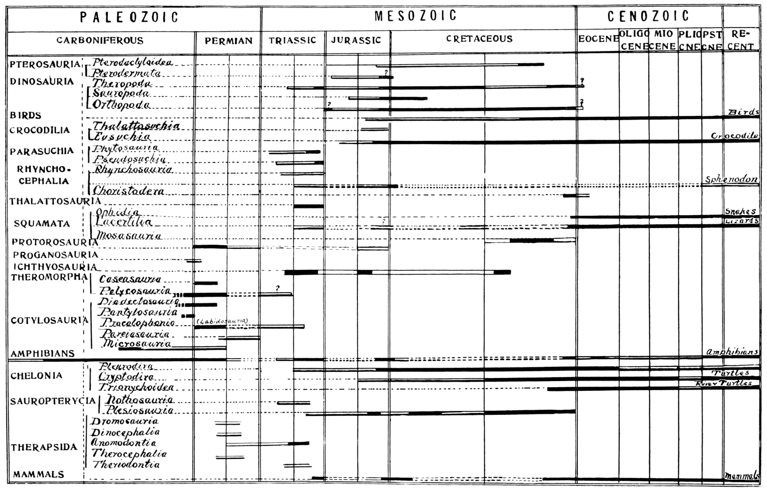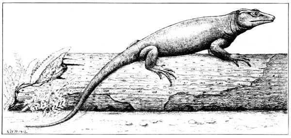 There are long periods of time, millions of years at a stretch perhaps, throughout which our knowledge amounts to little or nothing concerning many land reptiles which we are sure must have existed abundantly. No better example of our oftentimes scanty knowledge can be cited than the following. Until within the past fifteen years it was thought that true land lizards, of which there are about eighteen hundred species now living, dated back in their history no farther than about the close of the great Secondary Period, or the Age of Reptiles. But a single skull of a true land lizard has been discovered in the Triassic deposits of South Africa, a skull of a form so nearly like that of the modern iguana of America that its discoverer, Dr. Broom, has called it Paliguana. The lizards must have been in existence, probably many thousand species of them, during all the great interval of time between the Middle Triassic and the close of the Cretaceous, since it is a law which can have no exception, that a type of life once extinct never reappears. The “ancient iguanas” of the Trias must have been the forbears of many, if not all, of the lizards of later times, though nothing is known of their descendants through a period of time which can be measured only by millions of years. [Pg 6]