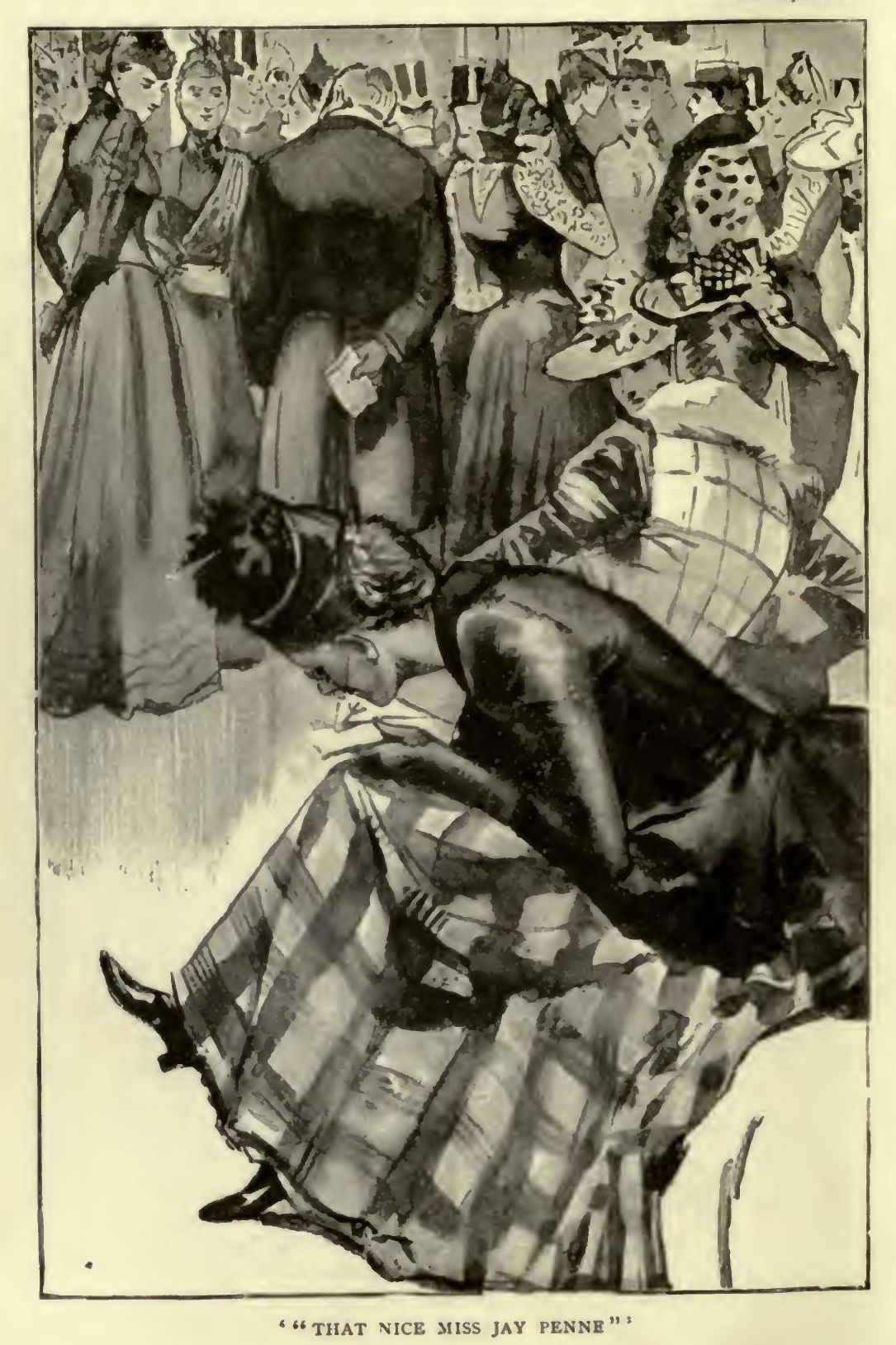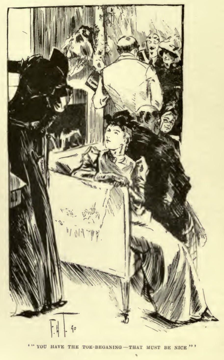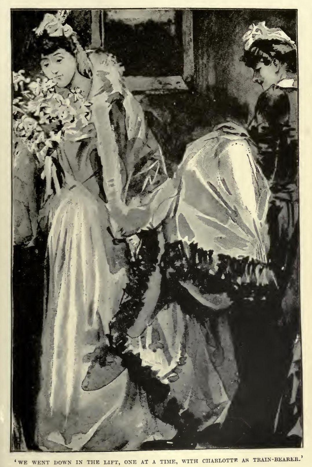 It was like a great, shimmering wave, radiant in colour, breaking in a hundred places into the foam of those dimpling feathers and streaming lappets, and it rushed with unanimity to the open door, stopping there, chafing, on this side of a silk rope and a Gentleman of the Court. We hurried on with the wave—Lady Torquilin and Mr. Oddie Pratte and I—and presently we were inextricably massed about half-way from its despairing outer edge, in an encounter of elbows which was only a little less than furious. Everybody gathered her train over her left arm—it made one think of the ladies of Nepaul, who wear theirs in front, it is said—and clung with one hand to her prodigious bouquet, protecting her pendent head-dress with the other. 'For pity's sake, child, take care of your lappets,' exclaimed Lady Torquilin. 'Look at that!' I looked at 'that'; it was a ragged fragment of tulle about a quarter of a yard long, dependent from the graceful head of a young lady immediately in front of us. She did not know of her misfortune, poor thing, but she had a vague and undetermined sense of woe, and she turned to us with speaking eyes. 'I've lost mamma,' she said, unhappily.