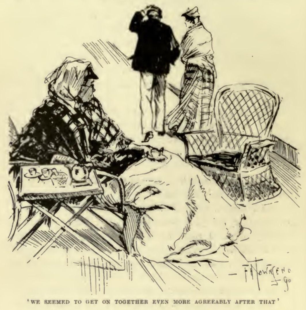 Mr. Mafferton appeared to know nobody on board but Mrs. Torquilin; and I made acquaintance with hardly anybody else, so that we naturally saw a good deal of each other, usually in the afternoons, walking up and down the deck. He lent me all his books, and I lent him all mine, and we exchanged opinions on a great variety of subjects. When we argued, he was always very polite and considerate; but I noticed one curious thing about him—I never could bring him round to my point of view. He did not seem to see the necessity of coming, although I often went round to his. This was a new experience to me in arguing with a gentleman. And he always talked very impersonally. At first this struck me as a little cold and uninterested, but afterwards I liked it. It was like drinking a very nice kind of pure cold water—after the different flavours of personality I had always been accustomed to. Mr. Mafferton only made one exception to this rule that I remember, and that was the afternoon before we landed. Then he told me particularly about his father and mother, and their tastes and occupation, also the names and ages of his brothers and sisters, and their tastes and occupations, and where he lived. But I cannot say I found him as interesting that afternoon as usual.