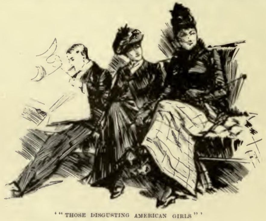 I'm afraid it was rather a late breakfast, and the lobby was full of people strolling in and out when I went through on my way to my room. I stood for a moment at the dining-room door looking at the lobby—I had heard so many Chicago people describe it—and I noticed in the seats that run around it, against the wall, two young women. They were leaning back nonchalantly, watching the comers and the goers. Both of them had their knees crossed, and one had her hands in her jacket pockets. A man in the seat next them, who might or might not have belonged to them, was smoking a large cigar. Two English ladies came out from breakfast behind me, stood waiting for somebody, and said one to the other: 'Look at those disgusting American girls!'