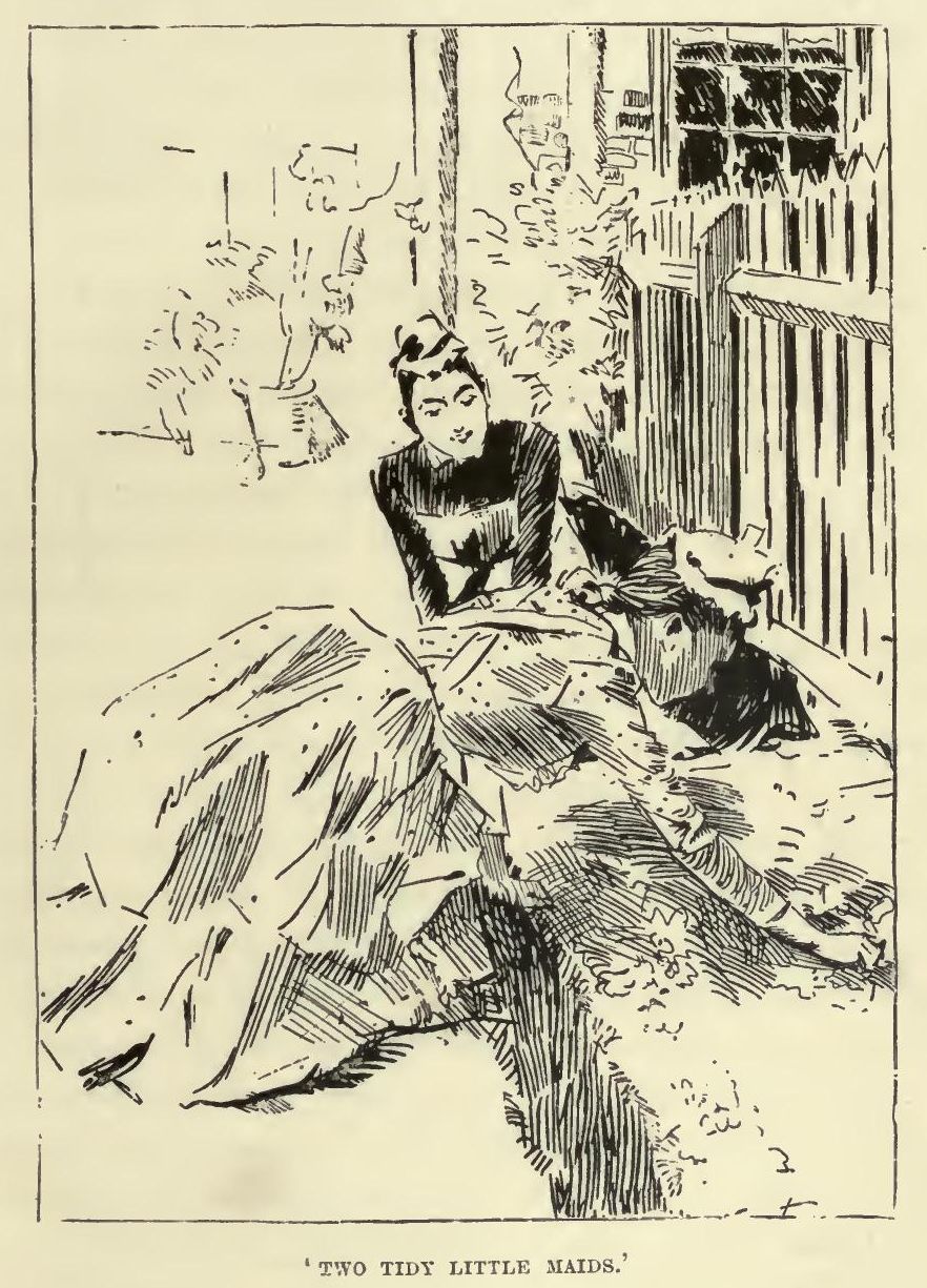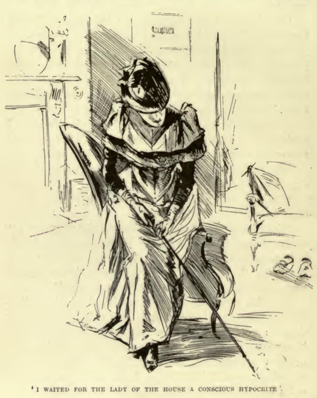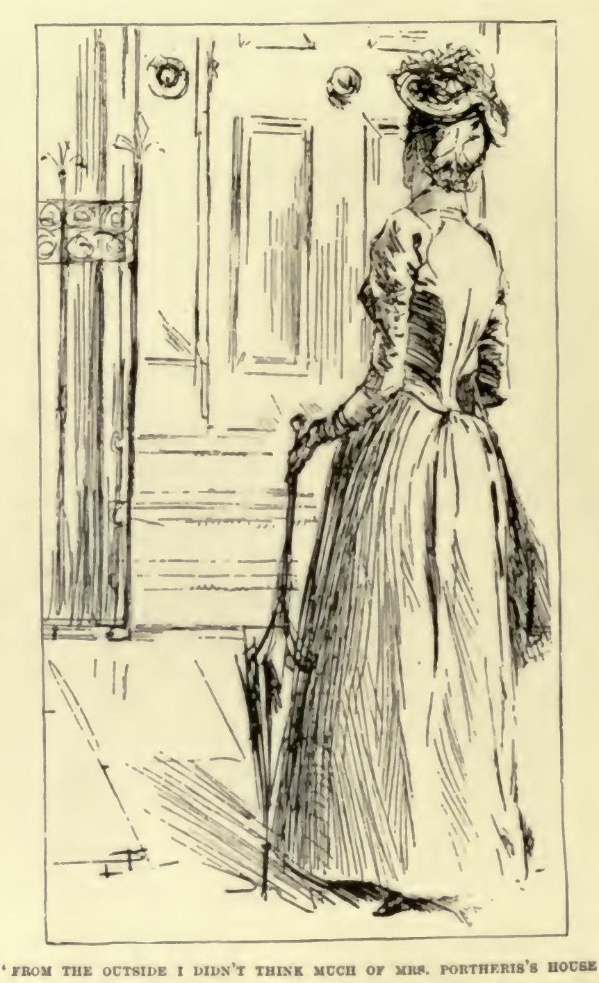 FROM the outside I didn't think much of Mrs. Portheris's house. It was very tall, and very plain, and very narrow, and quite expressionless, except that it wore a sort of dirty brown frown. Like its neighbours, it had a well in front of it, and steps leading down into the well, and an iron fence round the steps, and a brass bell-handle lettered 'Tradesmen.' Like its neighbours, too, it wore boxes of spotty black greenery on the window-sills—in fact, it was very like its neighbours, except that it had one or two solemn little black balconies that looked as if nobody ever sat in them running across the face of it, and a tall, shallow porch, with two or three extremely white stone steps before the front door. Half-Moon Street, to me, looked like a family of houses—a family differing in heights and complexions and the colour of its hair, but sharing all the characteristics of a family—of an old family. A person draws a great many conclusions from the outside of a house, and my conclusion from the outside of my relation's house was that she couldn't be very well off to be obliged to live in such a plain and gloomy locality, with 'Tradesmen' on the ground-floor; and I hoped they were not any noisy kind of tradesmen, such as shoemakers or carpenters, who would disturb her early in the morning. The clean-scrubbed stone steps reflected very favourably, I thought, upon Mrs. Portheris, and gave the house, in spite of its grimy, old-fashioned, cramped appearance, a look of respectability which redeemed it. But I did not see at any window, behind the spotty evergreens, the sweet, sad face of my relation, though there were a hand-organ and a monkey and a German band all operating within twenty yards of the house.