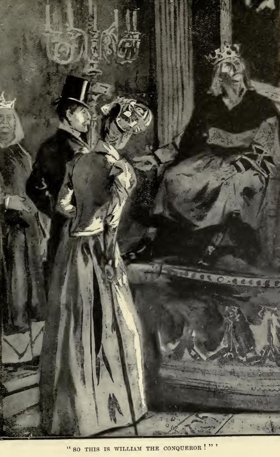 About twenty of us, this time, were let in at once. The last of the preceding twenty were slowly and singly pacing after one another's trains round two sides of this third big room towards a door at the farther corner. There was a most impressive silence. As we got into file I felt that the supreme moment was at hand, and it was not a comfortable feeling. Lady Torquilin, in front of me, put a question to a gentleman in a uniform she ought to have been afraid of—only that nothing ever terrified Lady Torquilin, which made it less comfortable still. 'Oh, Lord Mafferton,' said she—I hadn't recognised him in my nervousness and his gold lace—'How many curtseys are there to make?'