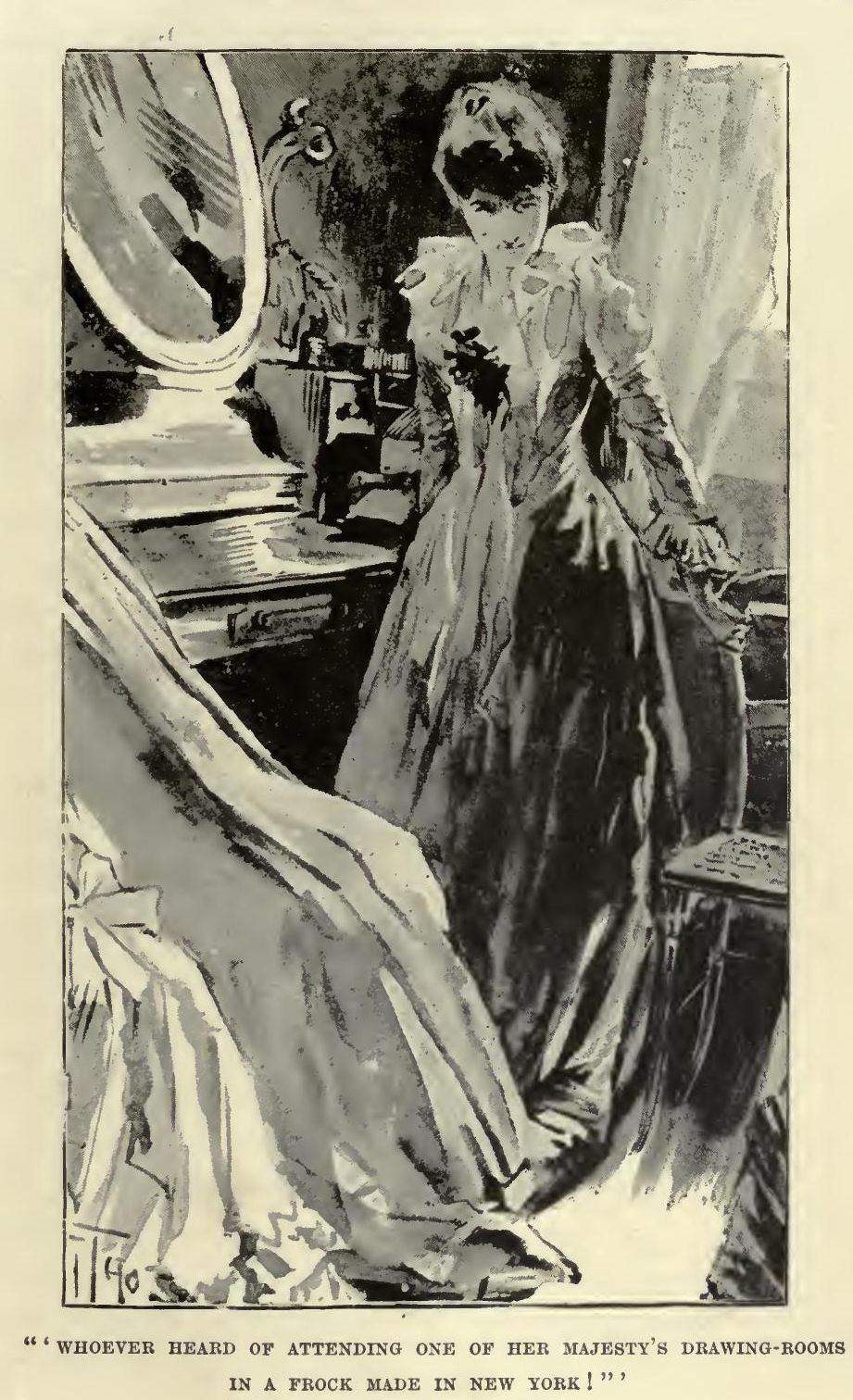 I like to linger over that fortnight's excitement—its details were so novel and so fascinating. First, the vague and the general, the creation of two gowns for an occasion extraordinary, mentioned by head ladies, in establishments where a portrait of Her Majesty hung suggestively on the wall, almost with bated breath. Lady Torquilin for once counselled a mild degree of extravagance, and laughed at my ideas—though she usually respected them about clothes—when I laid out for her inspection three perfectly fresh New York dresses, quite ideal in their way, and asked her if any of thom would 'do.' You have a great deal to learn, child!' she said. 'No, they won't, indeed! Who ever heard of attending one of Her Majesty's Drawing-Rooms in a frock made in New York! I'm not saying you haven't very nice taste over there, my dear, for that you have; but it stands to reason that your dressmakers, not having Court instructions, can't be expected to know anything about Court trains, doesn't it?' From which there was no appeal, so that the next day or two went in deep conferences with the head ladies aforesaid and absorbed contemplation of resultant patterns—which Lady Torquilin never liked to hear me call 'samples.' I was spared the trial of deciding upon a colour combination; being a young lady I was to go in white, Lady Torquilin gave me to understand, by edict of the Court. But should I have the train or the petticoat of the brocade, or would I prefer a bengaline train with a bodice and petticoat of crêpe de chine? Should the train come from the shoulder or be 'fulled' in at the waist; and what did I really think myself about ostrich tips grouped down one side, or bunches of field flowers dispersed upon the petticoat, or just a suggestion of silver embroidory gleaming all through; or perhaps mademoiselle might fancy an Empress gown, which would be thoroughly good style—they had made three for the last Drawing-Room? I had never been so wrought up about any dress before. Privately, I compared it to Lady Torquilin with the fuss that is made about a wedding-dress. 'My dear,' she exclaimed, candidly, 'a wedding-dress is nothing to it; as I dare say,' she added, roguishly pinching my cheek in a way she had, 'it won't be long before you find out!' But I don't think Lady Torquilin really know at the time anything about this.