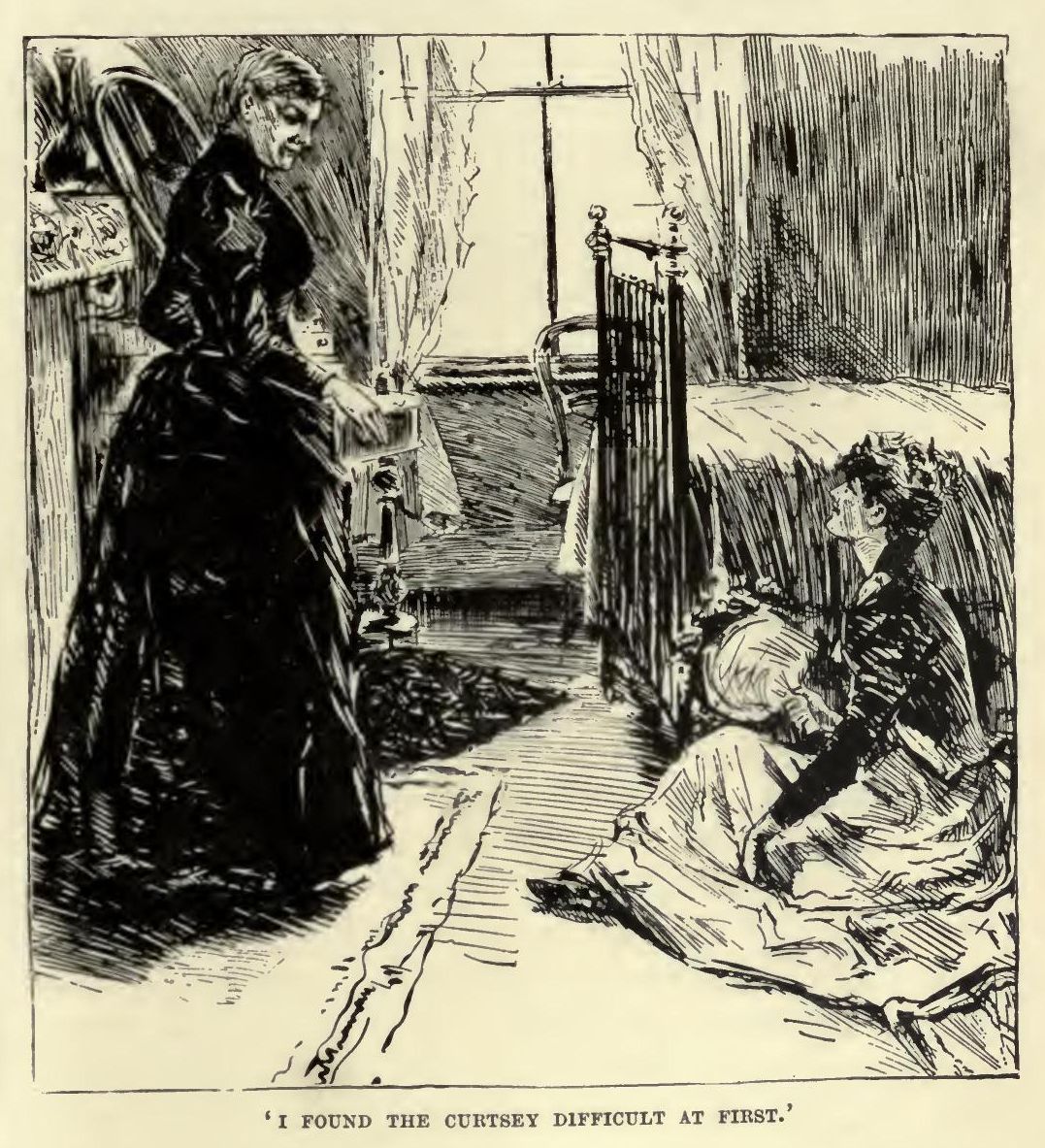 One thing that surprised me during that fortnight of preparation was the remarkable degree of interest shown in our undertaking by all our friends. I should have thought it an old story in London, but it seemed just as absorbing a topic to the ladies who came to see Lady Torquilin on her 'day,' and who had lived all their lives in England, as it was to me. They were politely curious upon every detail; they took another cup of tea, and said it was really an ordeal; they seemed to take a sympathetic pleasure in being, as it were, in the swirl of the tide that was carrying us forward to the Royal presence. If the ladies had been presented themselves they gave us graphic and varying accounts of the occasion, to which we listened with charmed interest; if not, they brought forth stories, if anything more thrilling, of what had happened to other people they knew or had heard of—the lady whose diamond necklace broke as she bent; the lady who forgot to take the silver paper out of her train at home, and left it in the arms of the Gentlemen of the Court as she sailed forward; the lady who was attacked by violent hysteria just as she passed the Duke of Edinburgh. Miss Corke's advice—though we relied upon nobody else—was supplemented fifty times; and one lady left us at half-past six in the afternoon, almost in tears, because she had failed to persuade me to take a few lessons, at a guinea a lesson, from a French lady who made a specialty of debutante presentations. I think I should have taken them, the occasion found me with so little self-reliance, if it had not been for Lady Torquilin. But Lady Torquilin said No, certainly not, it was a silly waste of money, and she could show me everything that was necessary for all practical purposes as well as Madame Anybody. So several mornings we had little rehearsals, Lady Torquilin and I, after breakfast, in my room, by which I profited much. We did it very simply, with a towel and whatever flowers were left over from dinner the night before. I would pin the towel to my dress behind and hold the flowers, and advance from the other end of the room to Lady Torquilin, who represented Her Majesty, and gave me her hand to kiss. I found the curtsey difficult at first, especially the getting up part of it, and Lady Torquilin was obliged to give me a great deal of practice.