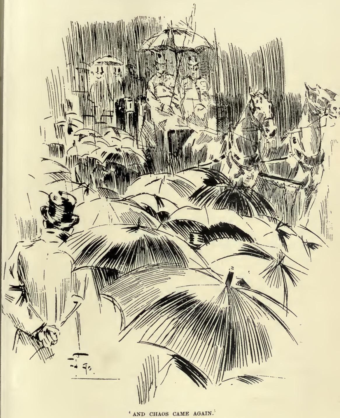 The weather looked threatening as we drove off, precisely at twelve o'clock, and presently it began to rain with great industry and determination. The drops came streaming down outside the carriage windows; fewer people as we passed leaned out of hansoms to look at us. Inside the Mafferton carriage we were absurdly secure from the weather; we surveyed our trains, piled up on the opposite seat, with complacency; we took no thought even for the curl of our feathers. We counted, as we drove past them to take our place, and there were forty carriages in line ahead of us. Then we stopped behind the last, in the middle of a wide road, heavily bordered under the trees with damp people and dripping umbrellas—there for the spectacle. All kinds of people and all kinds of umbrellas, I noticed with interest—ladies and gentlemen, and little seamstresses, and loafers and ragamuffins, and apple-women, and a large proportion of your respectable lower middle-class. We sat in state amongst them in the rain, being observed, and liking it. I heard my roses approved, and the nape of my neck, and Lady Torquilin's diamonds. I also heard it made very unpleasant for an elderly young lady in the carriage in front of ours, whose appearance was not approved by a pair of candid newsboys. The policemen kept the people off, however; they could only approach outside a certain limit, and there they stood, or walked up and down, huddled together in the rain, and complaining of the clouded carriage windows. I think there came to me then, sitting in the carriage in the warmth and pride and fragrance and luxuriance of it all, one supreme moment of experience, when I bent my head over my roses and looked out into the rain—one throb of exulting pleasure that seemed to hold the whole meaning of the thing I was doing, and to make its covetable nature plain. I find my thoughts centre, looking back, upon that one moment.