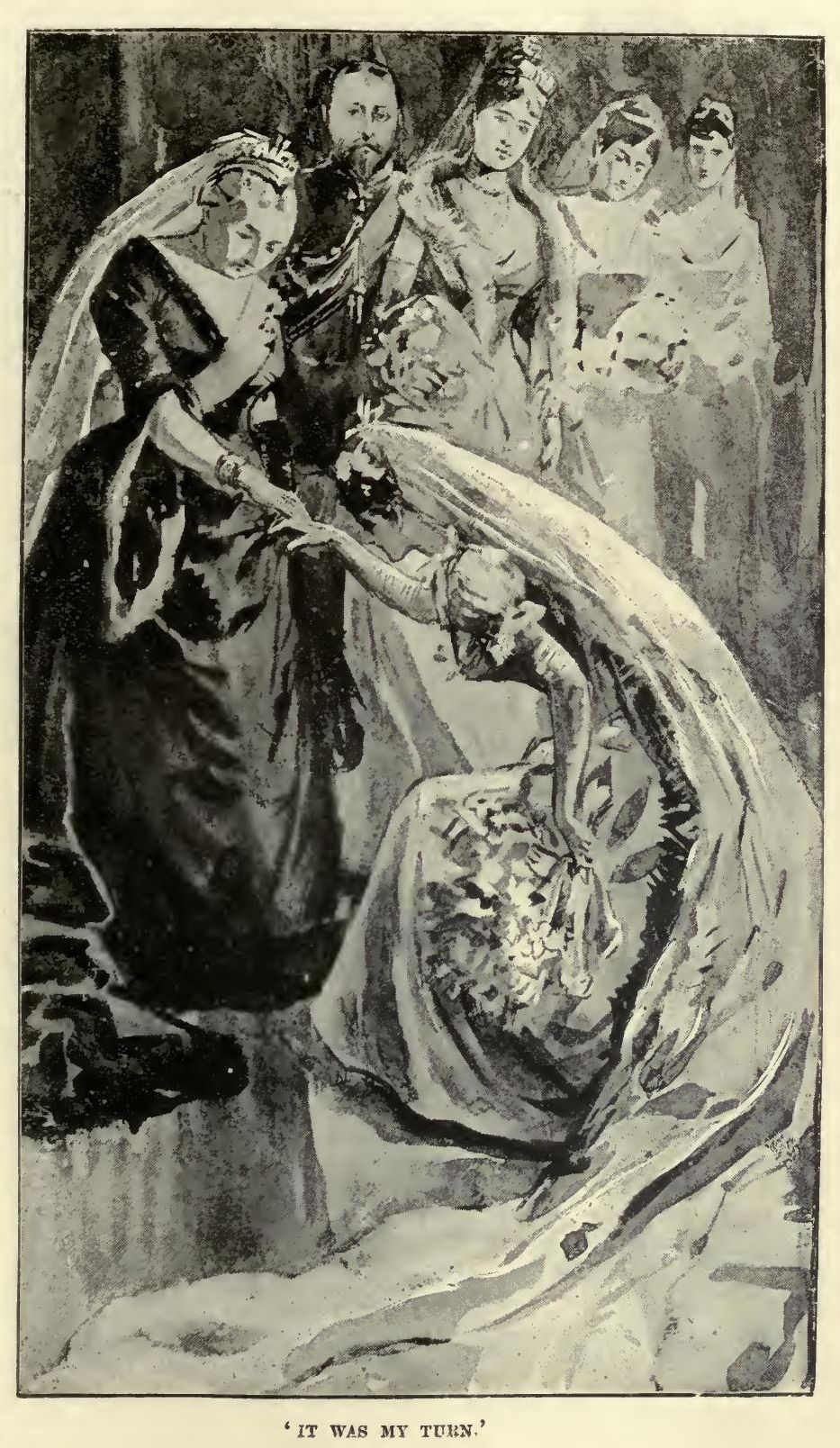 The question as to what Lady Torquilin would do, if not what was required of her, rose vividly before me, and kept me company at every step of that interminable round. 'Am I all right?' she whispered over her shoulder from the other end of that trailing length of pansy-coloured velvet. 'Perfectly,' I said. But there was nobody to tell me that I was all right—I might have been a thing of shreds and patches. Somebody's roses had dropped; I was walking on pink petals. What a pity! And I had forgotten to take off my glove; would it ever come unbuttoned? How deliberately we were nearing that door at the farther end! And how could I possibly have supposed that my heart would beat like this! It was all very well to allow one's self a little excitement in preparation; but when it came to the actual event I reminded myself that I had not had the slightest intention of being nervous. I called all my democratic principles to my assistance—none of them would come. 'Remember, Mamie Wick,' said I to myself, 'you don't believe in queens.' But at that moment I saw three Gentlemen of the Household bending over, and stretching out Lady Torquilin's train into an illimitable expanse. I looked beyond, and there, in the midst of all her dazzling Court, stood Queen Victoria. And Lady Torquilin was bending over her hand! And in another moment it would be—it was my turn!
