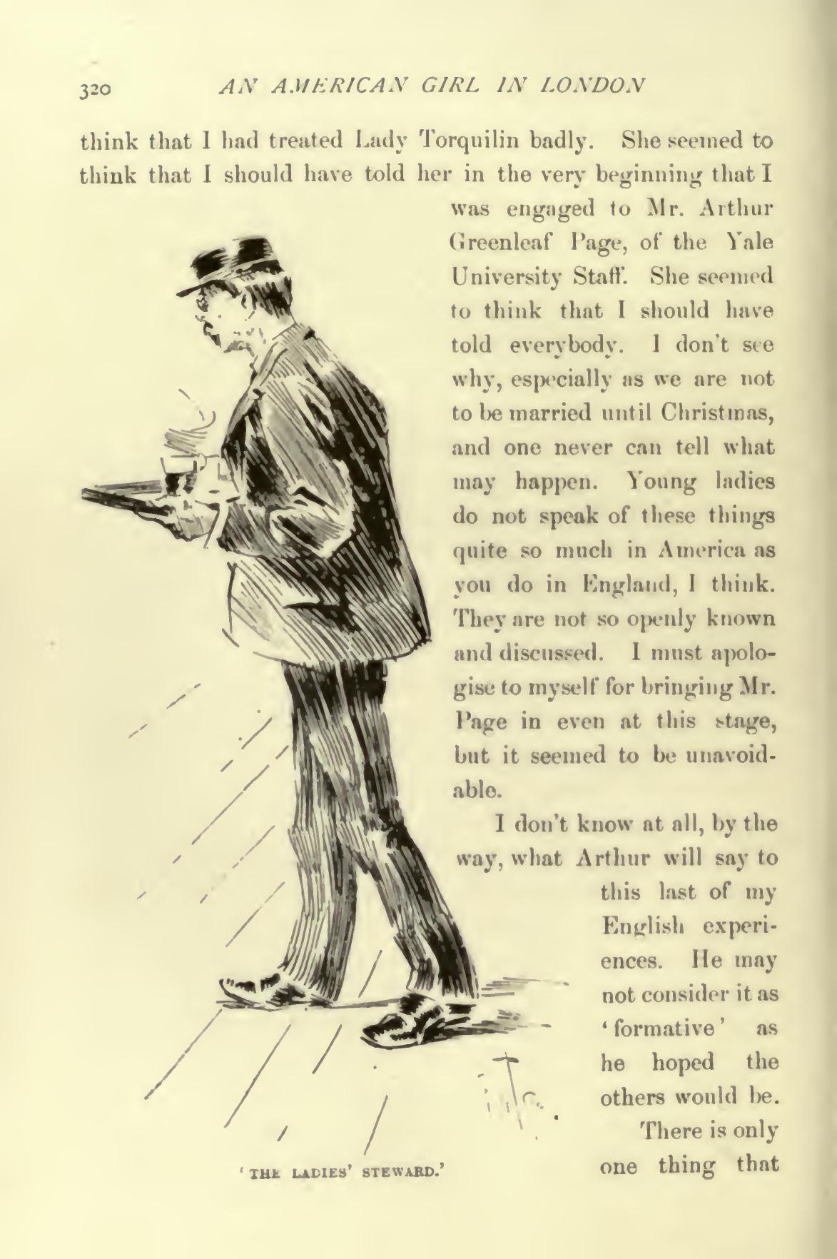 The worst of it was Lady Torquilin's scolding next morning—not that she said anything unkind, but because it gave me the idea that I had treated her badly too. I should be so sorry to think that I had treated Lady Torquilin badly. She seemed to think that I should have told her in the very beginning that I was engaged to Mr. Arthur Greenleaf Page, of the Yale University Staff. She seemed to think that I should have told everybody. I don't see why, especially as we are not to be married until Christinas, and one never can tell what may happen. Young ladies do not speak of these things quite so much in America as you do in England, I think. They are not so openly known and discussed. I must apologise to myself for bringing Mr. Page in even at this stage, but it seemed to be unavoidable.