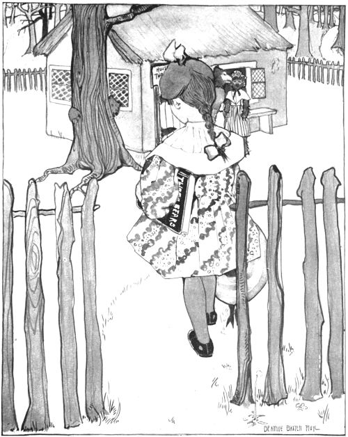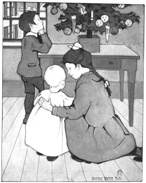 And it was a bright little tree, set up in a starch box, with[Pg 41] the balls hung where they showed to the best advantage, and the paper dolly tied fast to the top bough, where her tattered skirts were less noticeable, and no one minded or even thought that she had only one wing. The gold balls glistened as good as new when the dust was rubbed off, and when later the candle had burned out, the apple and the orange had been divided and eaten, and the festivities were over, the little pink ball rejoiced to find herself going to bed with the fat baby; then clasped tight in the hot little hand and nestling close to the pink cheek, she sent up a little prayer of thanks to the Christmas Angel, which was as near saying real prayers as a Christmas tree ornament ever comes.
