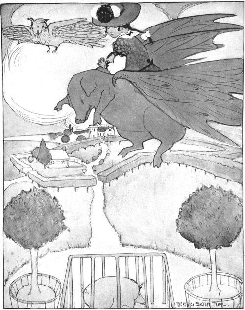 So pleased was Mother Goose with her plan, that she had to call out to the old woman with the pig who lived next door, and who was cleaning house very hard, always in hopes of finding another silver sixpence, to ask her if she would come and bring her pig.