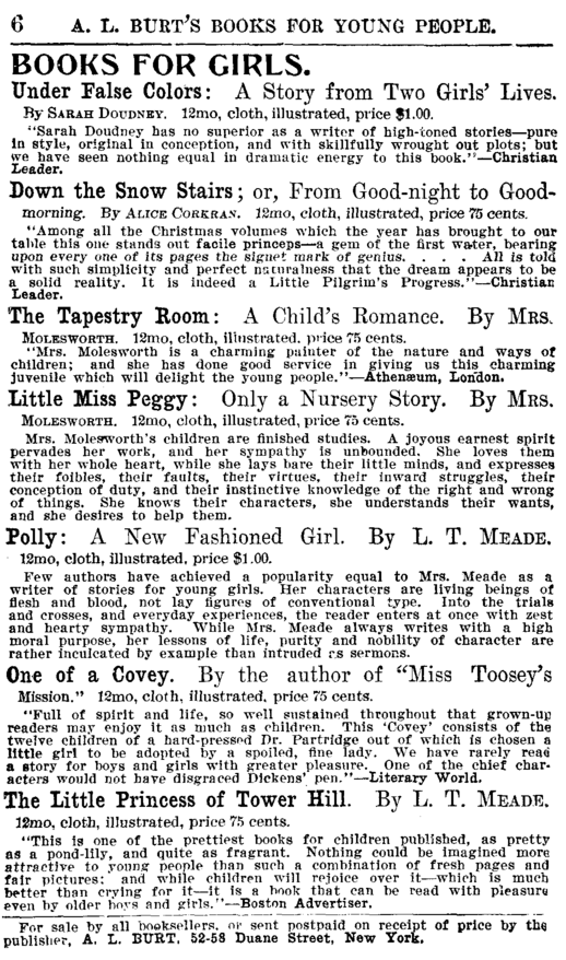 “I am not going to ask you where you found the story; I only want you to see, and see so plainly that you can never forget it, how small and mean a thing such a deceit, or any deceit, is, and how sure in the end to turn to the injury of the one who commits it. Of all the class that are to leave me, you, Susan Downer, carry away with you my greatest anxiety for your future. God help and save you, you poor child!”