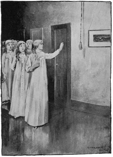 Twenty white-robed girls in ghost-like procession headed for the Fräulein’s room.—Page 189. Miss Ashton’s New Pupil.