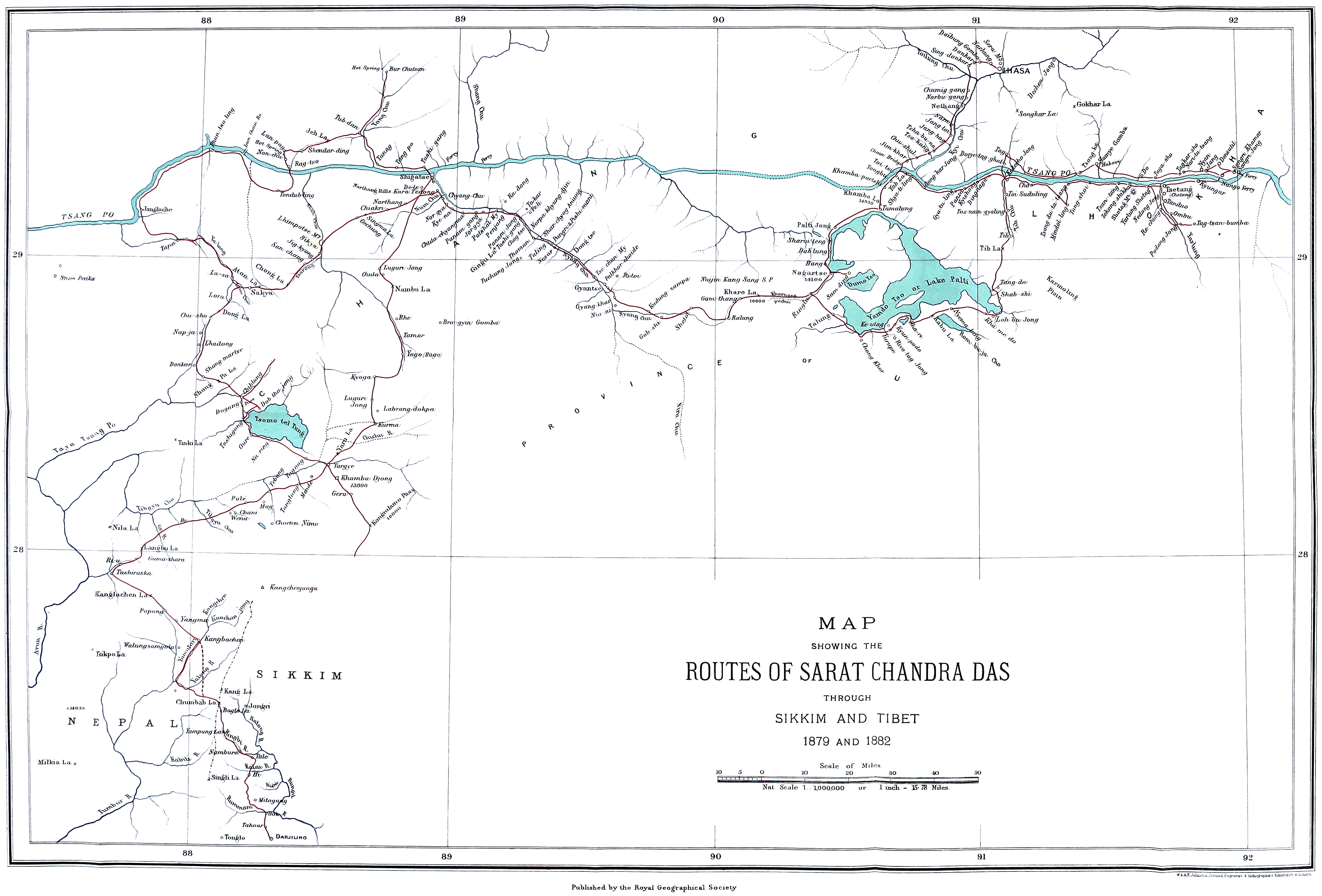 This brief notice of Sarat Chandra’s literary work will suffice, however, to show that his labours in this field are as important as those which he has rendered to geography. Personally, I am under a lasting debt of gratitude to him for the valuable information which he gave me while in Peking, and which was later on of great use to me during my explorations in Tibet, and I hold myself particularly fortunate in having been chosen by the Royal Geographical Society to edit his reports, as it is a means of publicly expressing my indebtedness to him, and also, I trust, of helping him to take the place he so justly deserves beside Csoma de Kőrös, as one of the greatest pioneers of exploration and discovery in Tibet.