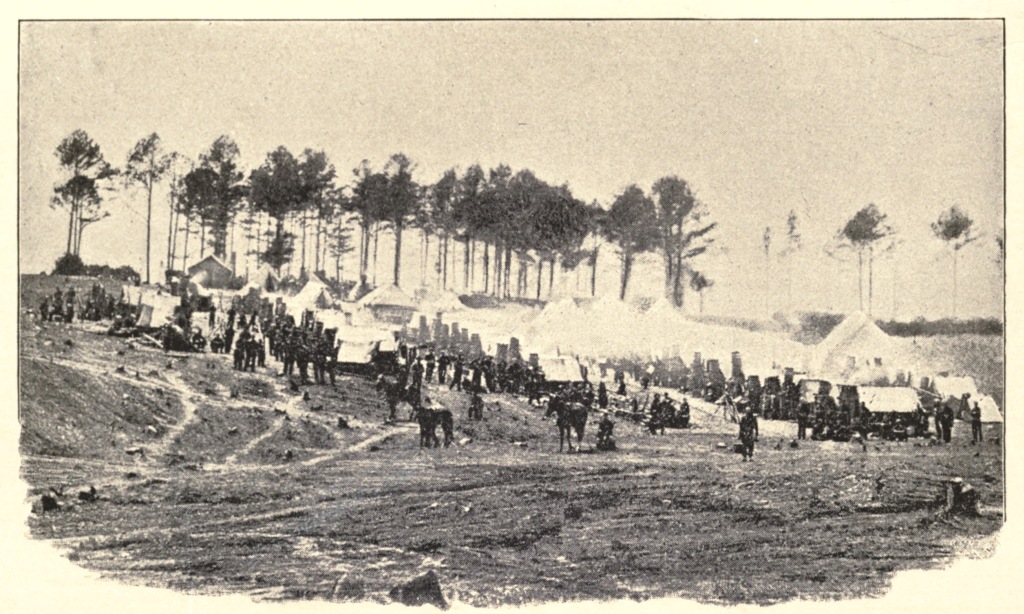 I next joined the army on January 1, 1864. It was still at Brandy Station, but instead of Yancey’s house I found awaiting my arrival the most picturesque home I have ever lived in; it will ever be remembered as one of the brightest surprises of my life. Imagine two ordinary army tents, set close together, one of them for a parlor and dining-room,[Pg 30] the other for a bedroom; both having chimneys of mud and stone, presenting fine open fireplaces with real mantel-pieces on the inside; the bedstead was of plain pine timber, and the bedding delicious, sweet, clean straw sewed up in sacks, the whole covered with a layer of several brown woollen army blankets; there were, of course, no pillows or pillow-cases, a couple of saddles answered for the one, and I presume imagination had to do service for the other; yet we were supremely happy. I was a soldier, and these were war times, and I prided myself that I could dispense with luxuries and yet be comfortable. [There is no woman who can, better than I, enjoy beautiful surroundings, and who absolutely craves all the exquisite luxe that is obtainable, or can sleep more deliciously under the light, warm, silken eider-down, but it[Pg 31] is a great satisfaction that these war experiences have fitted me to climb a mountain, sleep upon a bare floor, or ride twenty miles in a rain storm, and overcome situations which, without them, I never would have surmounted.] But it was bitterly cold sometimes that winter in these canvas houses, and I did not dare leave my bed in the mornings until our man, who was maid-of-all-work, built a great big log fire and literally drove us out of bed with the heat. And, oh! what a grandiose parlor did I step into for breakfast the first morning I was there, with its works of art cut from the illustrated newspapers of the day, framed with strips of red flannel, while on my mantel were spread varieties of bonbons imported expressly from Washington to celebrate my arrival. Our table service was of pure tin, washed and[Pg 32] burnished with sand and water after every meal, and because our spoons were of the same material our soup was not a jot the less savory; as we seldom indulged in French peas our two-pronged forks answered every purpose, and as I occasionally managed to borrow a table-cloth and sometimes a napkin from our neighbor Yancey, our little tête-à-tête dinners were quite recherché, considering the surroundings. But my habitation was a gem, worthy a place in any collection of “Happy Homes.” When, however, my baby daughter and her nurse joined me I gave up my “open-air” life and returned to the Yancey mansion, where I remained until General Grant, fresh from his marvellous victories in the West, came among us and made preparations for his advance to Richmond.