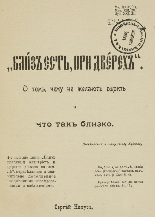In January, 1917, Mr. Nilus published another book under the title “It is Near, At the Door,” and in this book the Protocols were again published in full. A reproduction of the title page of this book is inserted at the beginning of this volume.