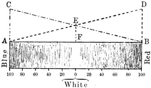 This device enables us at once to understand the consequence of mentally displacing the zero, while physically the scale remains unchanged. When red is the prevailing colour in the field of vision, we are inclined to consider it unduly pale; in other words we imagine it to be nearer the zero of the scale than is actually the case, and so are[Pg 160] led to shift our standard of whiteness from the middle slightly towards the red end of the scale. The new position assigned to white, being a little to the right of the point marked 0 in Fig. 35, is one where, under customary circumstances, the colour would be called pale red. At the same time, an object which is normally white, and is exactly matched at the middle of the scale, would be a little to the left of the imaginary zero, and would consequently appear to be of a greenish-blue tint.