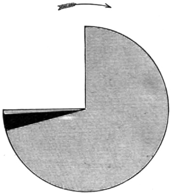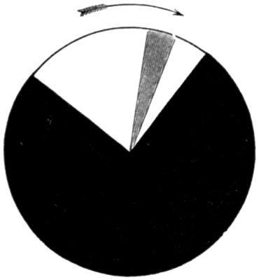 The apparatus which Charpentier employed for demonstrating and measuring the duration of this effect is very simple. It consists of a blackened disk with a white sector, mounted upon an axis. When the disk is illuminated by sunlight and turned rather slowly, the direction of the gaze being fixed upon the centre, there appears upon the white sector,[Pg 188] close behind its leading edge, a narrow but quite conspicuous dark band. (See Fig. 39.) The portion of the retina which at any moment is apparently occupied by the dark band, is that upon which the light reflected by the leading edge of the white sector impinged one sixtieth of a second previously.