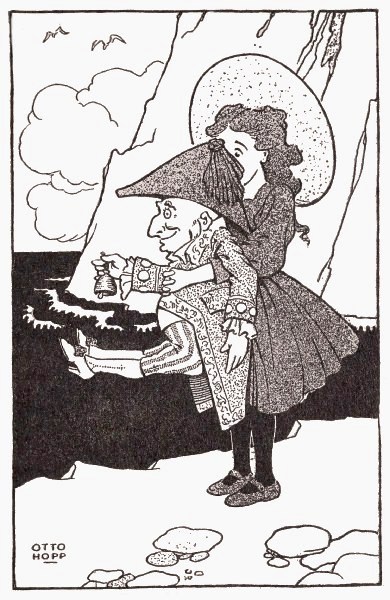 Margaret took a step forward, when her shadow—that very same shadow she had been vainly pursuing all morning—her shadow fell on the rock at the little man's feet. He looked up, and instantly his whole manner changed. He stopped ringing his bell, and clapping his heels together he made a bow so low that the red tassel on his hat swept the ground.